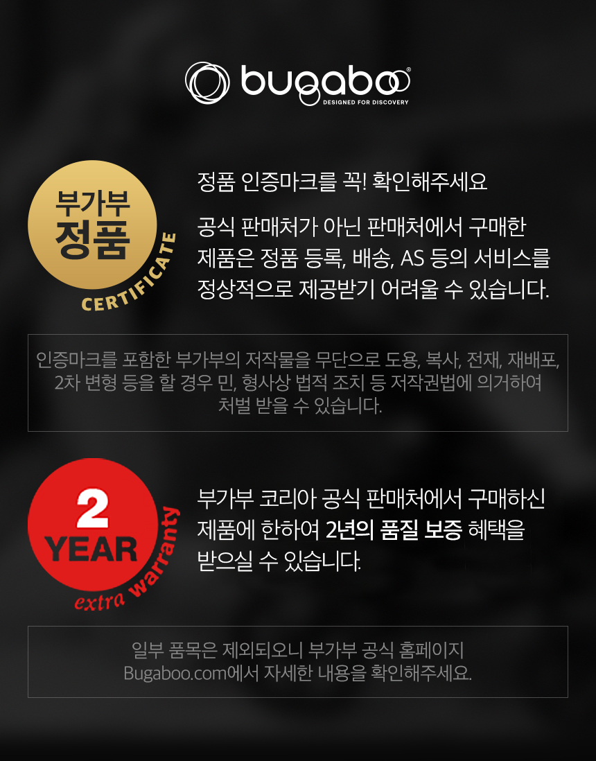 부가부(BUGABOO)는 1999년부터 혁신적인 육아용품을 선보이고 있는 브랜드로, 육아용품의 한계를 넘어 일상을 더욱 편리하게 만들고 세상을 더 나은 모습으로 변화시킬 혁신적인 디자인을 선보입니다. 업계 표준을 뛰어넘는 엄격한 테스트를 통해 안전하고 편안하며 신뢰할 수 있는 제품을 만듭니다.