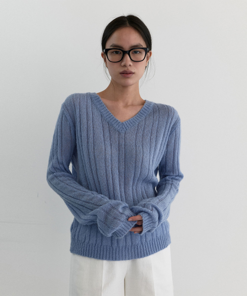 시어 브이넥 니트_더스트 블루