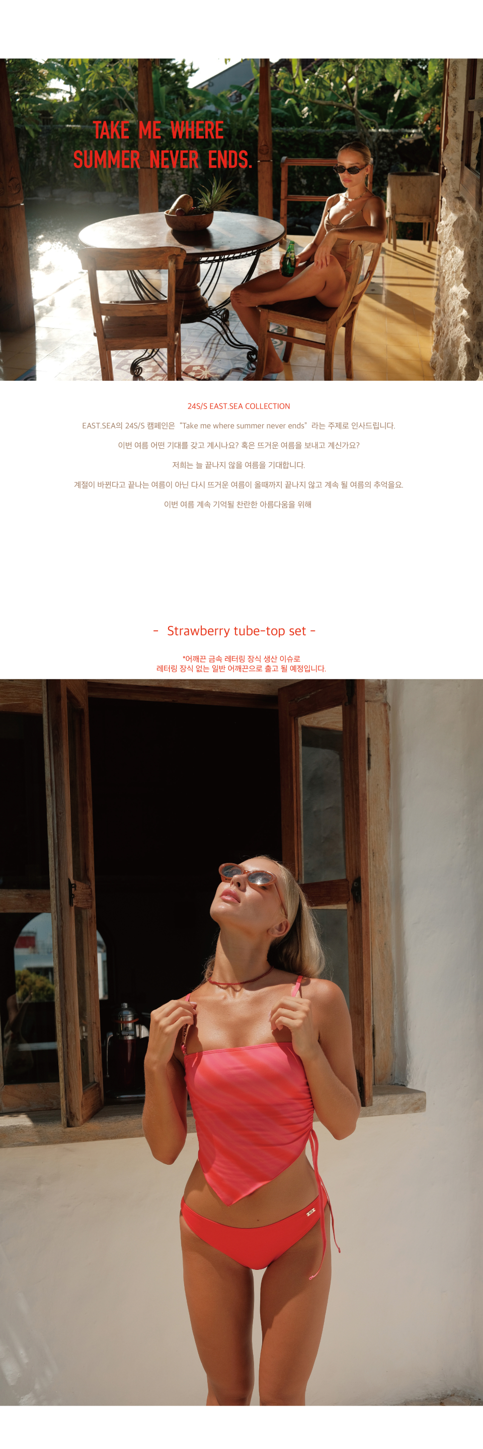 이스트씨(EAST SEA)는 무더운 여름 아래 아름다운 것을 향유하는 스윔웨어 브랜드입니다. 일렁이는 파도와 내리쬐는 햇볕 아래에서 사랑하는 사람들과 함께 휴식, 사랑, 여유를 즐기며 그 속의 다양한 이야기를 담아냅니다. 먹고 마시고 수영하며 끝나지 않을 여름을 위한 아이템을 제안합니다.