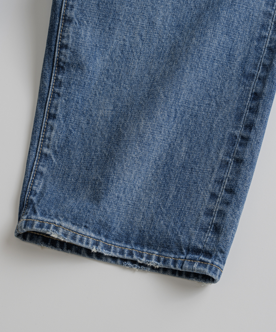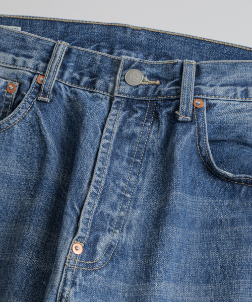 기본 5 POCKET 사양에 5개의 벨트 루프 형식으로 되어있으며, 밑단에는 인위적인 데미지를 더해 세월감을 표현했습니다.