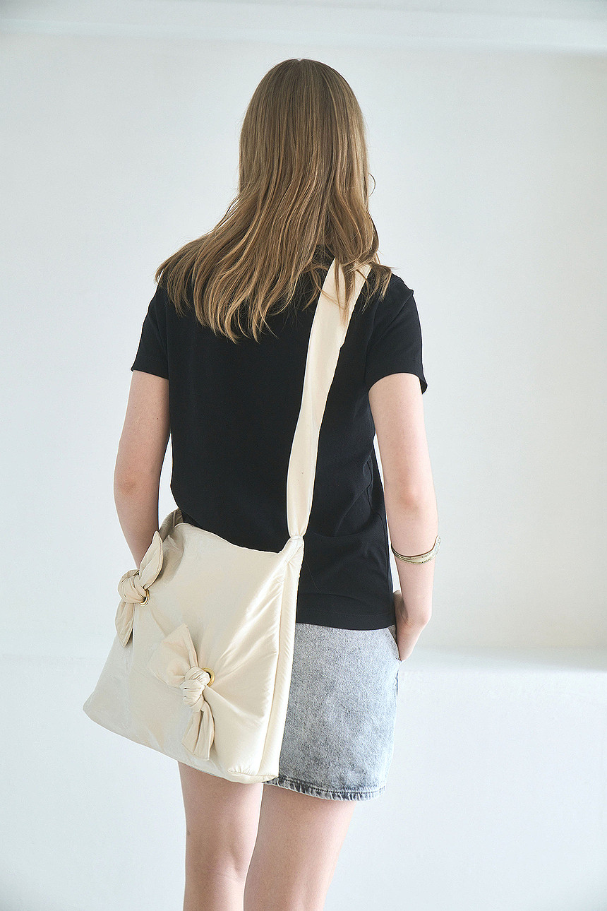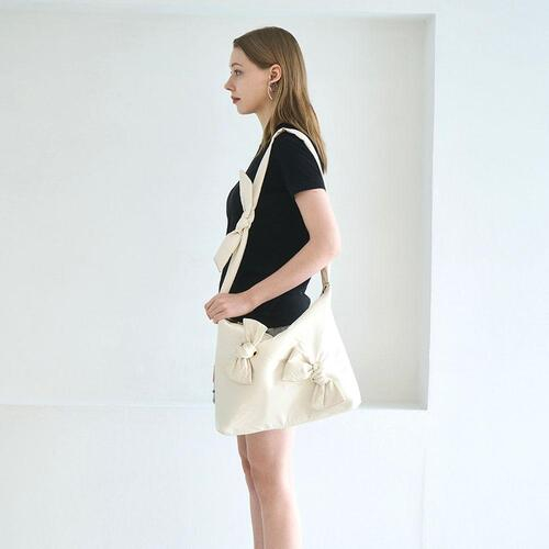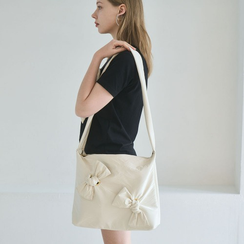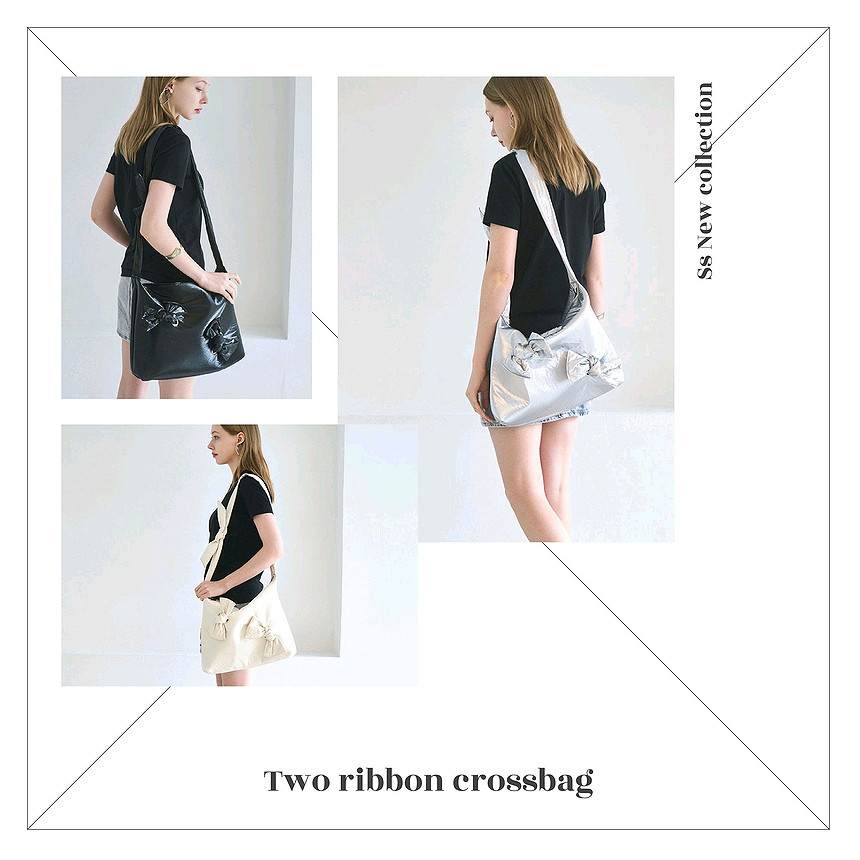 스트랩을 매듭지어 리본 타이 느낌으로 자유롭게 길이 조절할 수 있어 숄더와 크로스백으로 활용 가능합니다.