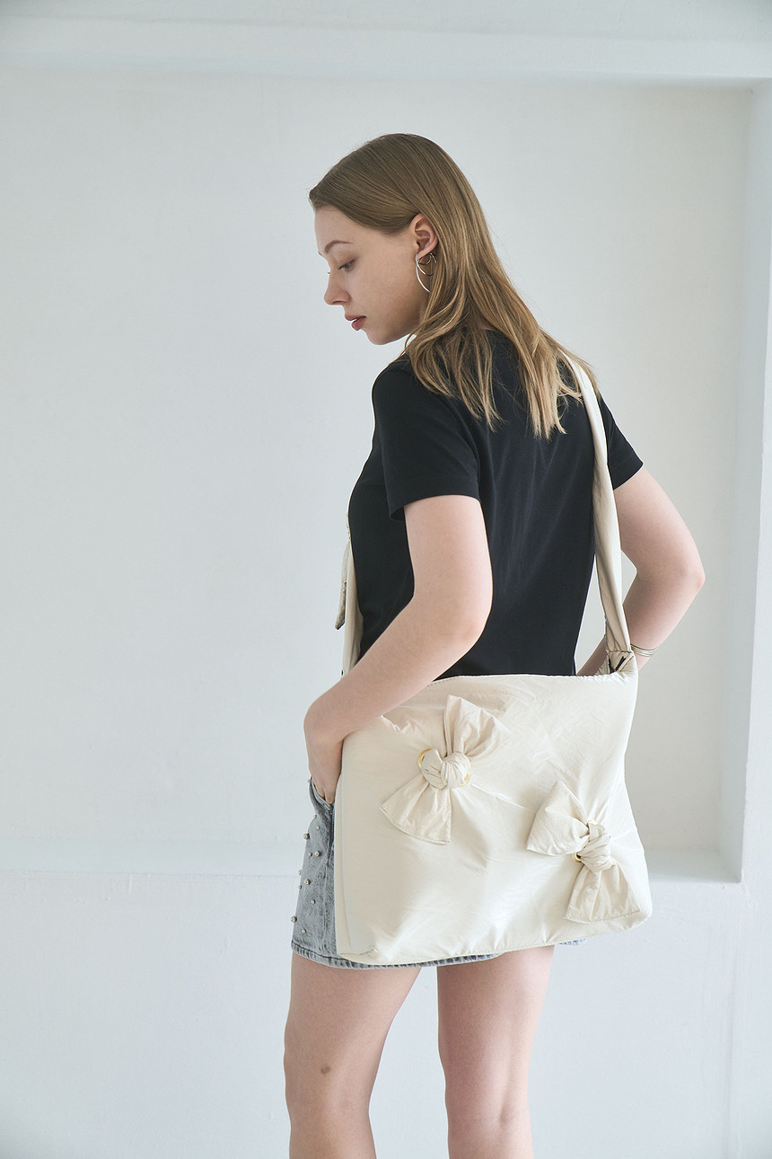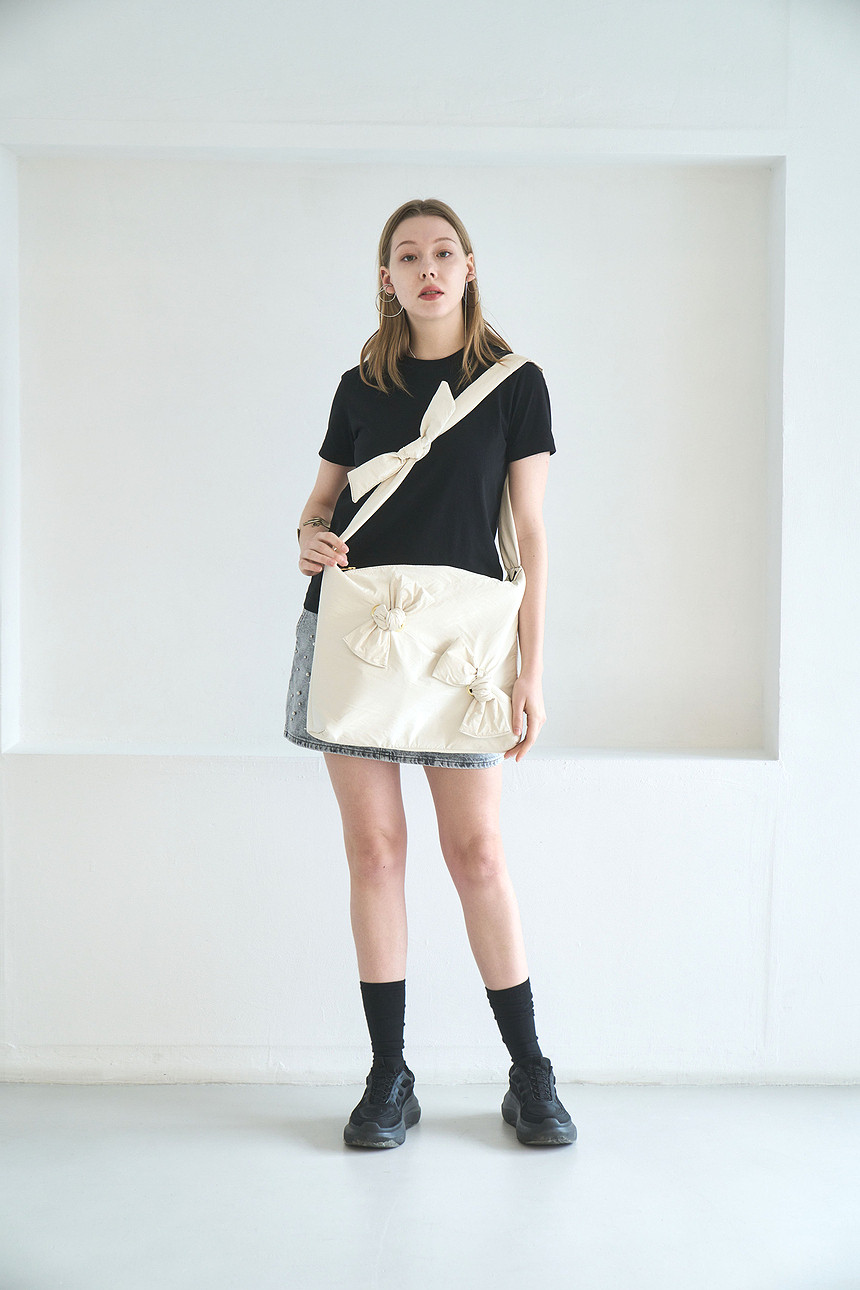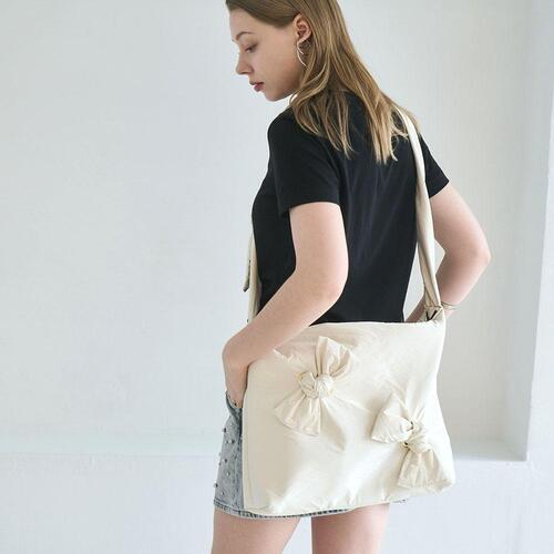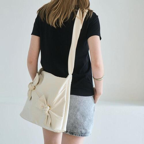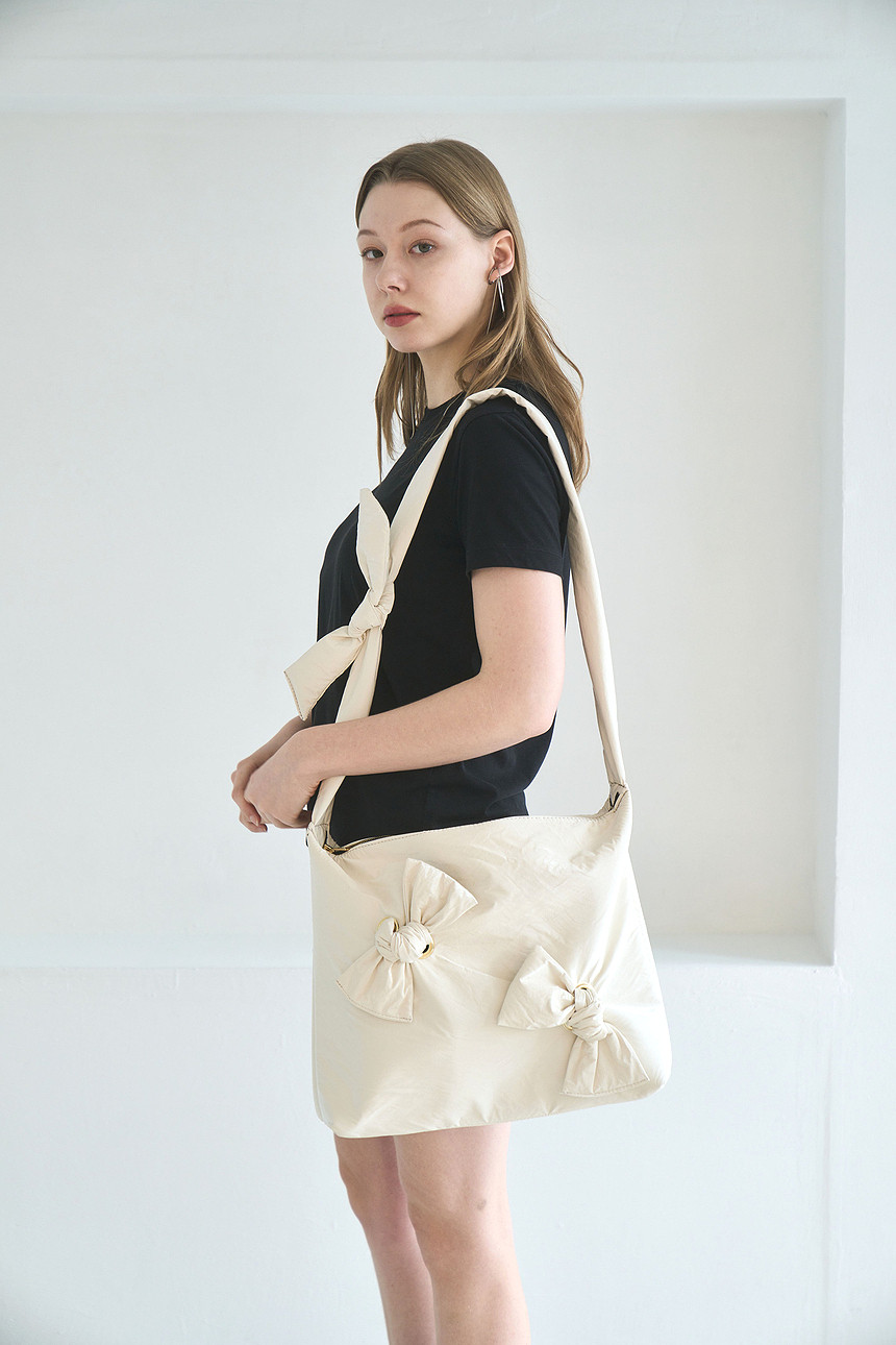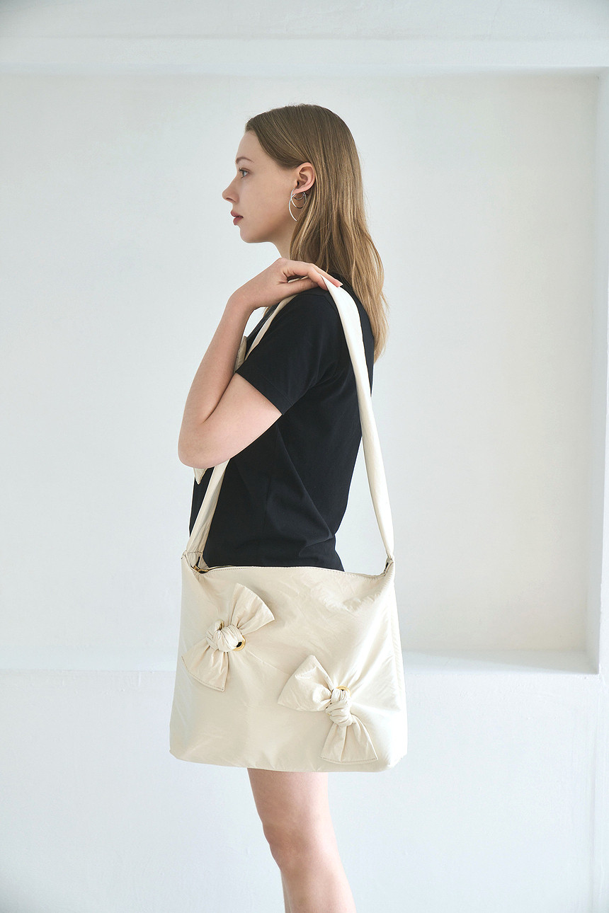 리본 타이 스타일로 스트랩을 매듭지어 길이 조절이 가능하여 숄더와 크로스로 맬 수 있습니다.