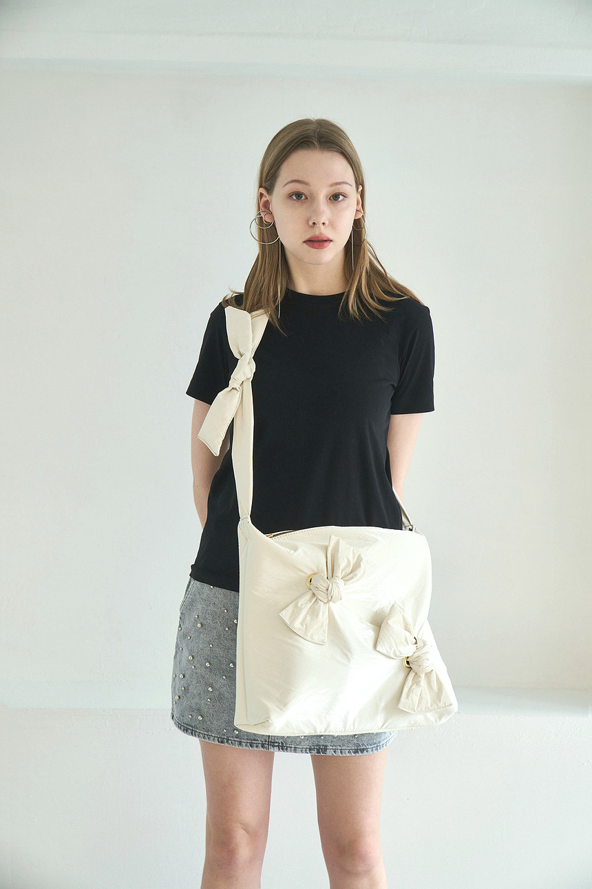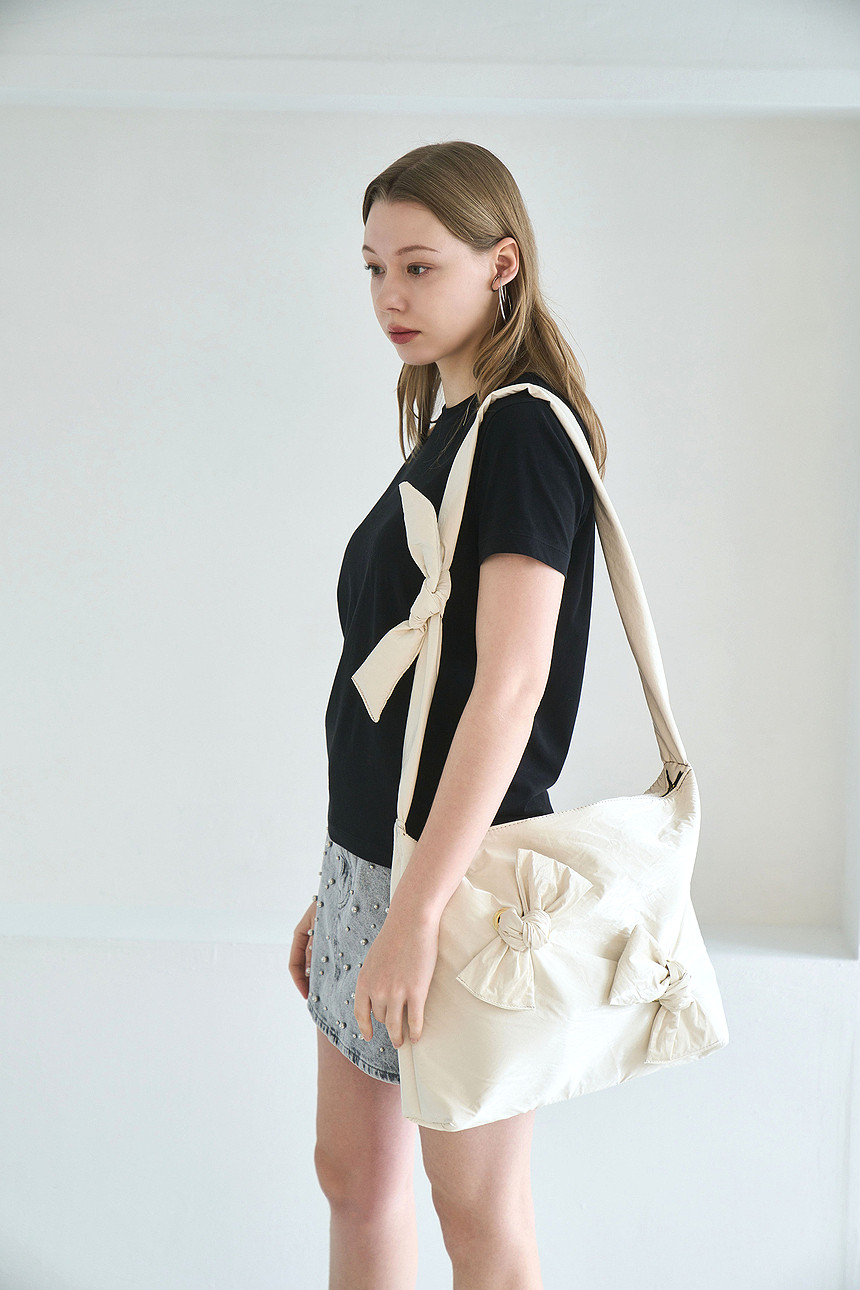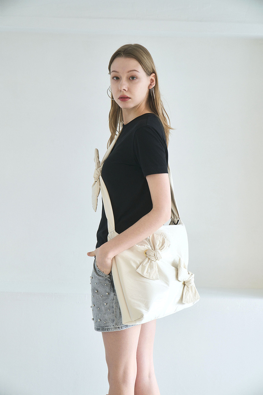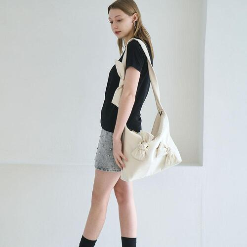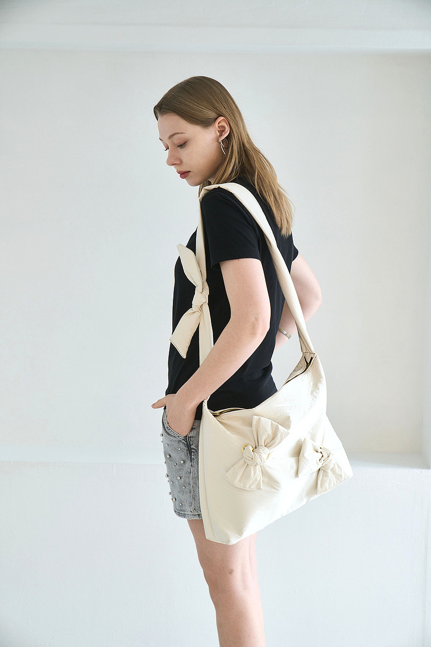 리본 타이 스타일로 스트랩을 매듭지어 길이 조절이 가능하여 숄더와 크로스로 맬 수 있습니다.