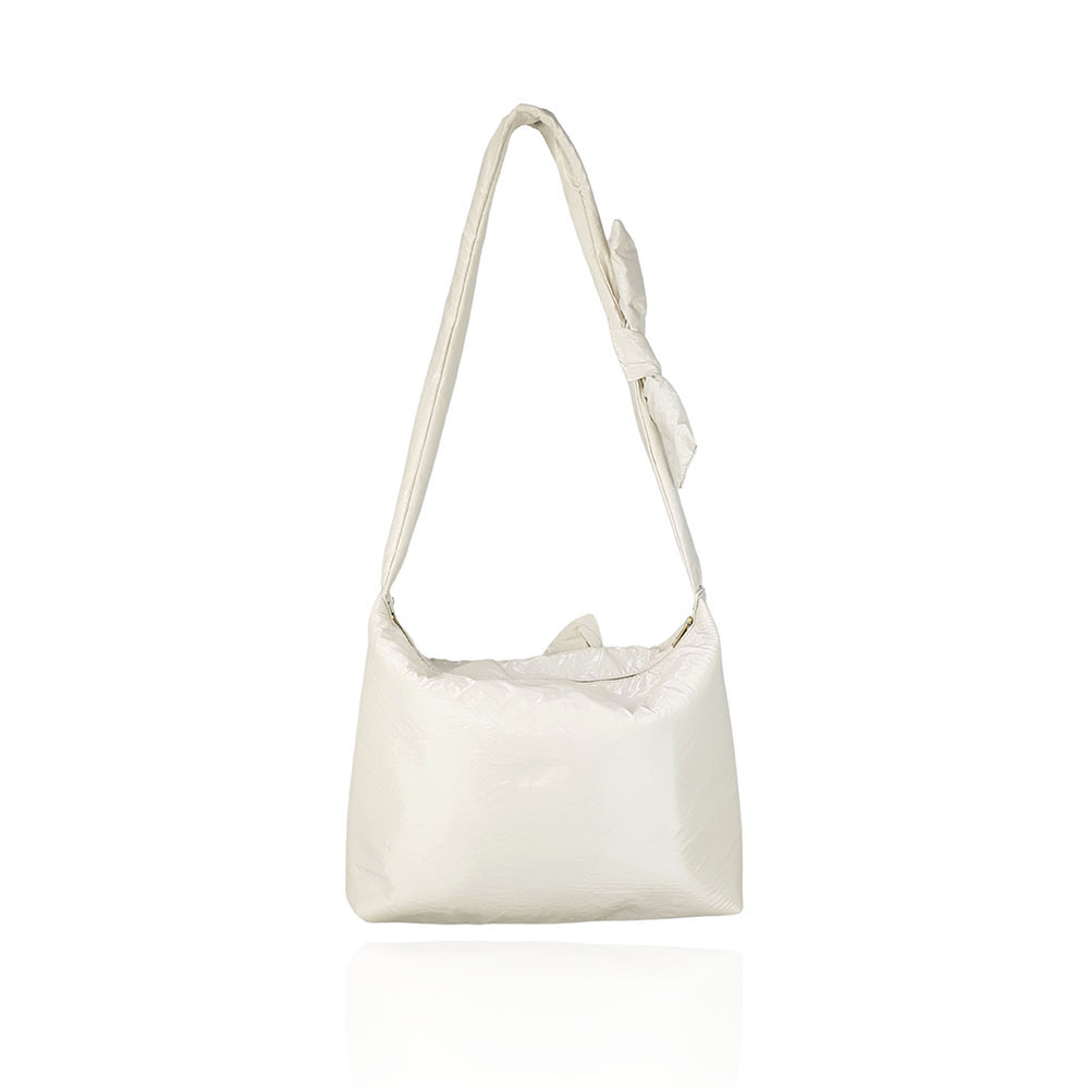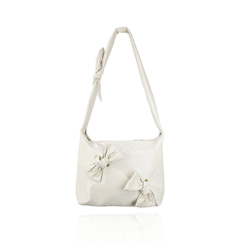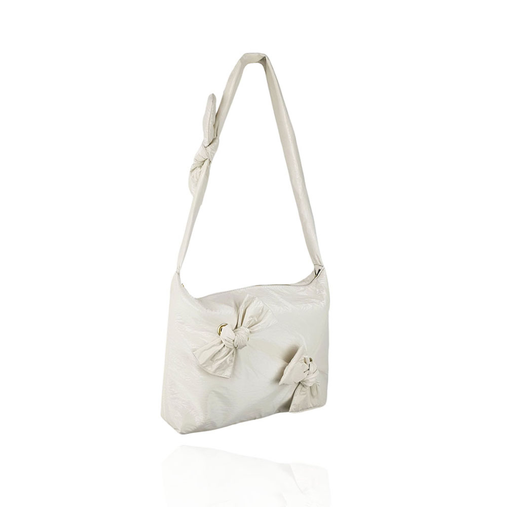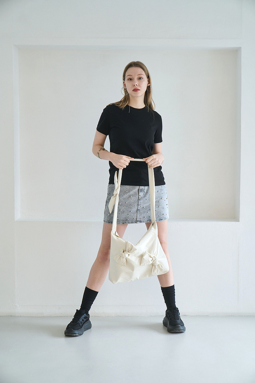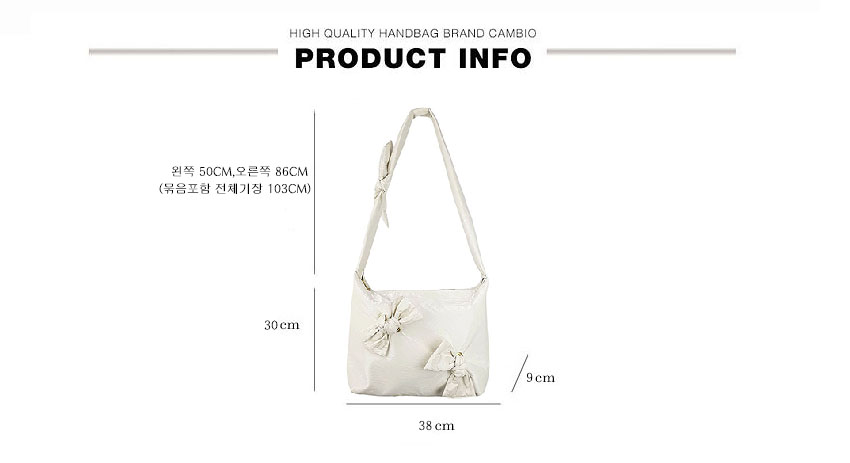 리본 타이 스타일로 스트랩을 매듭지어 길이 조절이 가능하여 숄더와 크로스로 맬 수 있습니다.