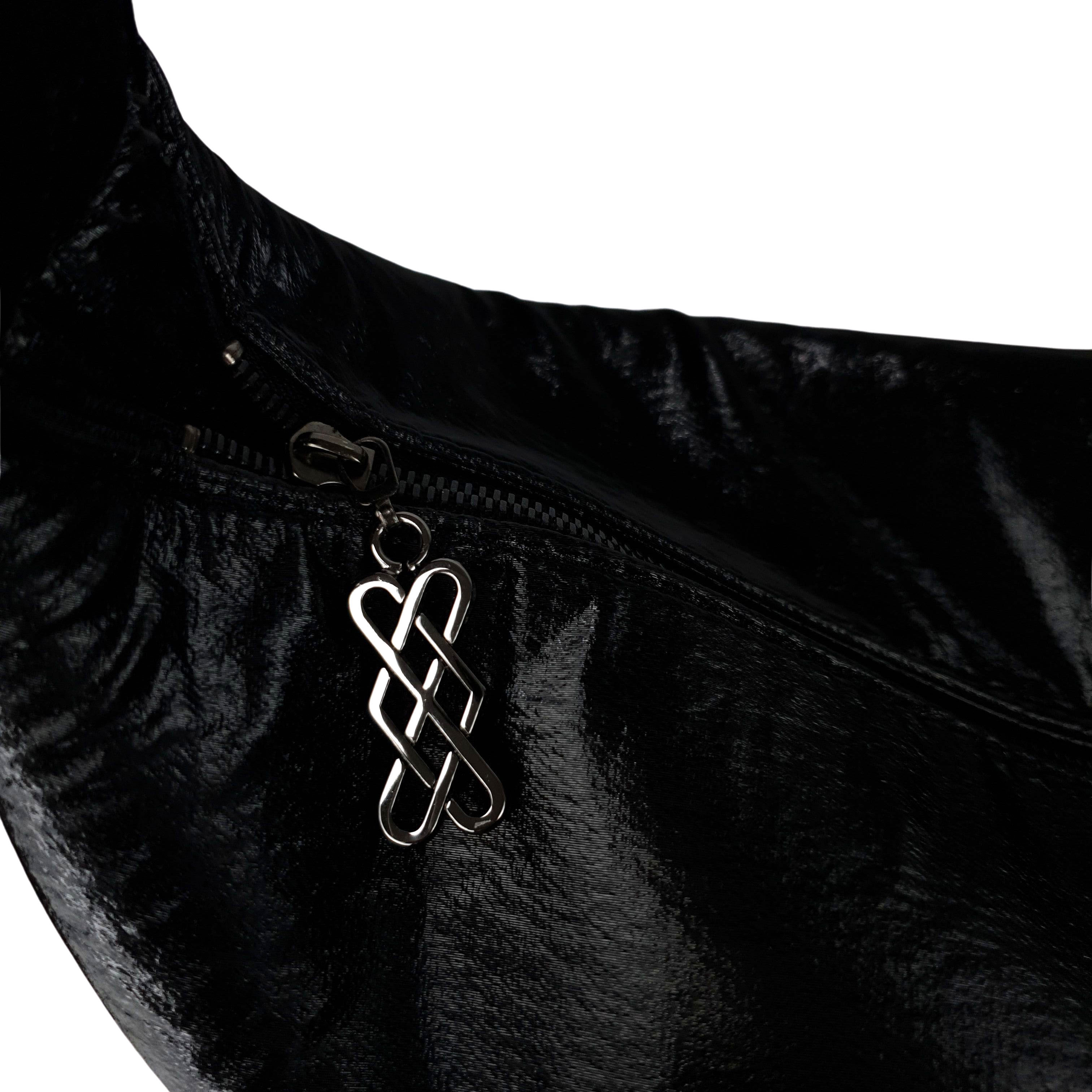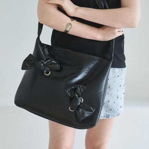 흑니켈 아일렛에 두 개의 큼직한 리본 묶음 포인트 되어 스포티하고 유니크한 가방입니다.