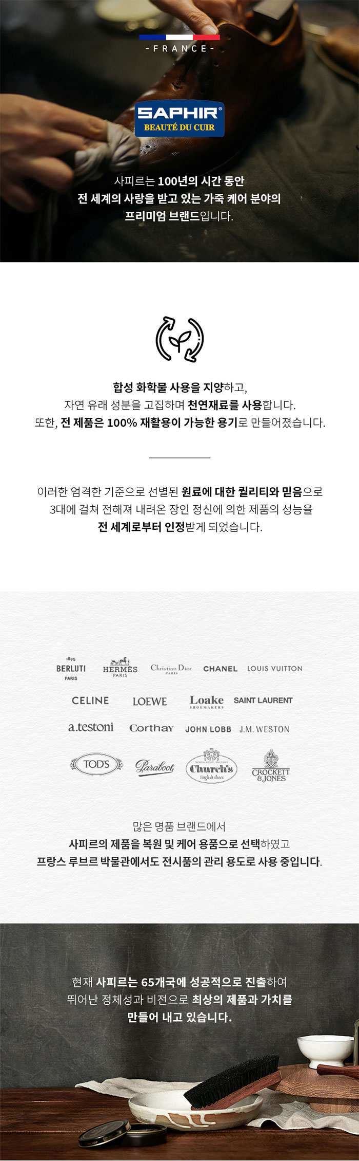 SAPHIR(사피르)는 1920년 프랑스 파리에서 설립된 프랑스를 대표하는 가죽케어 브랜드입니다. 꾸준한 연구와 최고의 재료의 결과로 가죽의 보존과 관리, 품질과 다양성으로 세계 여러나라로 수출하고 있습니다. 1925년 가죽제품의 장인정신을 오래 즐길 수 있도록 본래의 특성을 살린 케어제품 프리미엄라인을 출시하여 더욱 완벽한 제품을 선보이고 있습니다.