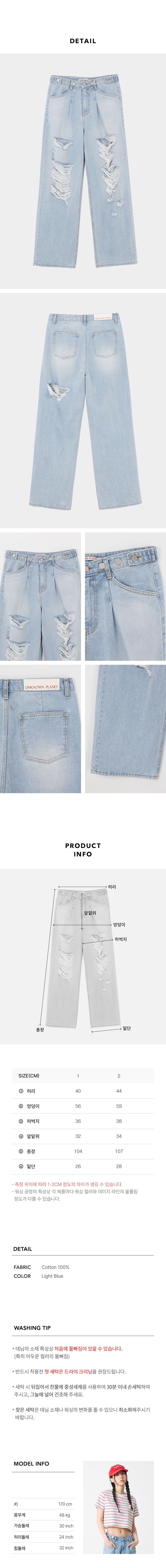 커스텀 원턱 디스트로이드 와이드 데님 팬츠 라이트 인디고