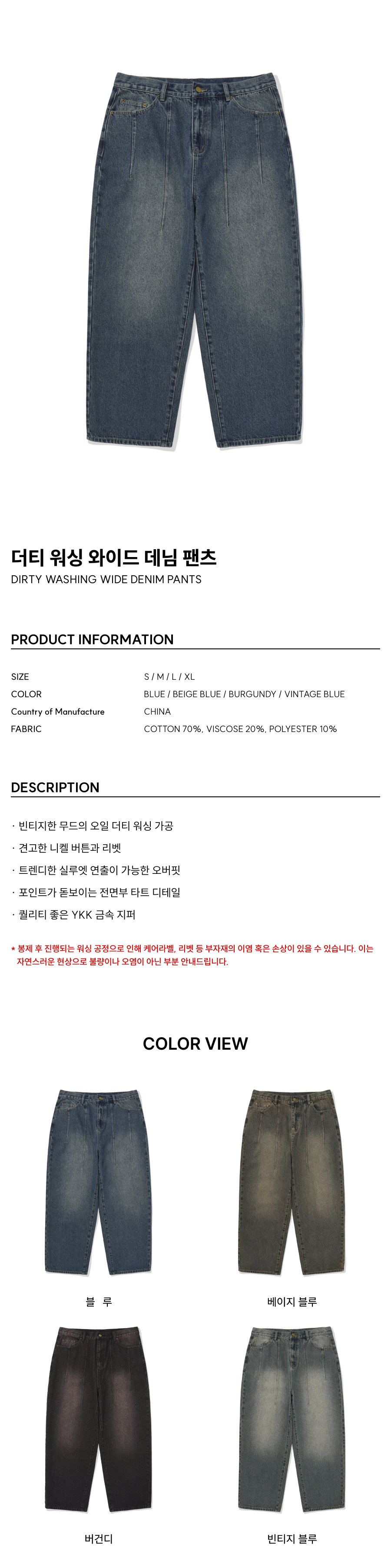 더티 워싱 와이드 데님 팬츠 블루
