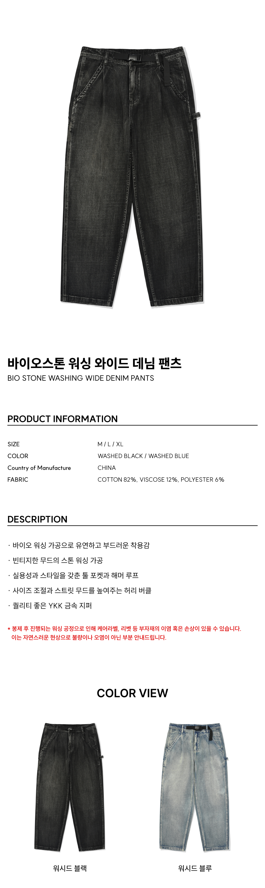 바이오스톤 워싱 와이드 데님 팬츠 워시드 블랙