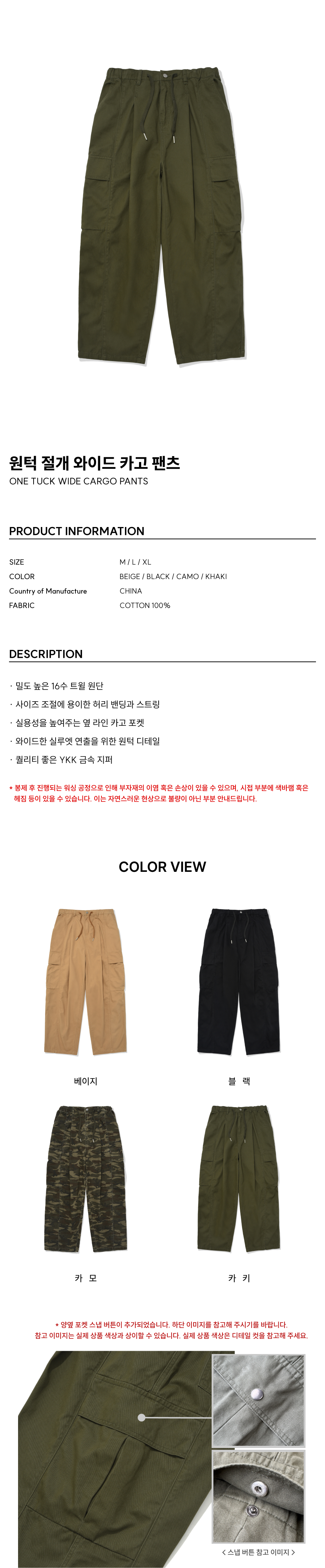 원턱 절개 와이드 카고 팬츠 카키