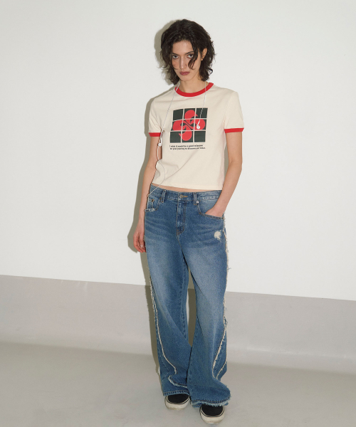 BUTTON STRIPE RAW EDGE T-SHIRT / black