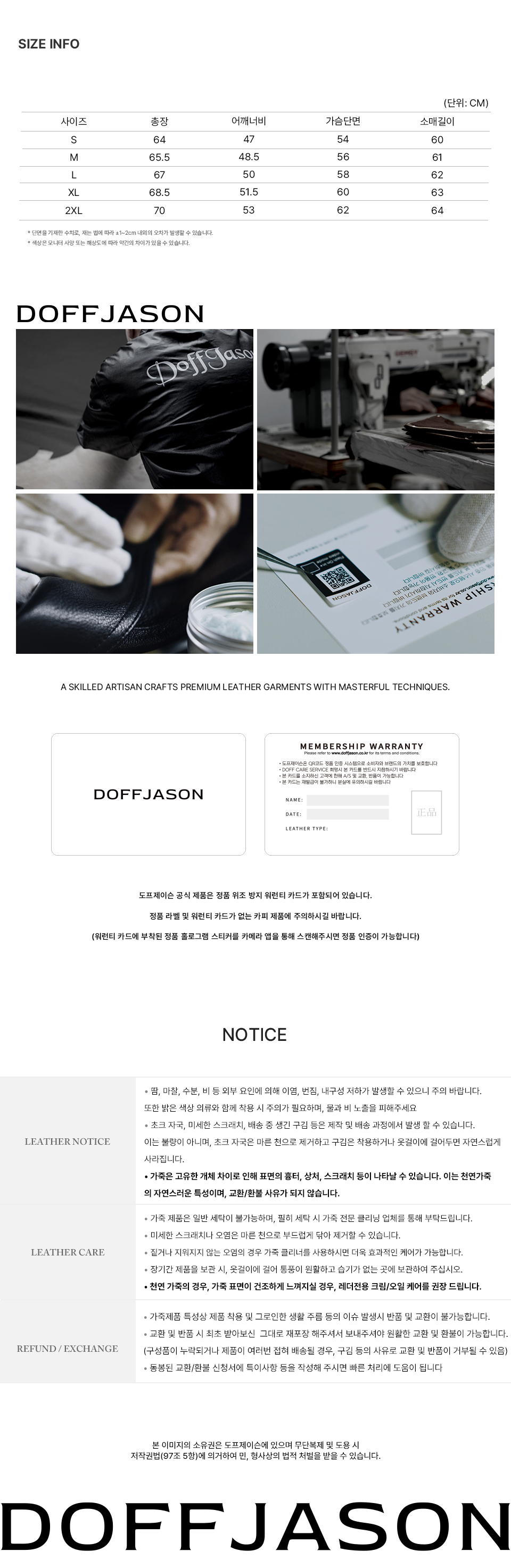 도프제이슨(DOFFJASON)은 가죽이라는 소재에 대한 이해를 기반으로 레더 가먼츠를 중심으로 디자인하는 브랜드입니다. 스타일에 구애받지 않고 오래 입을수록 가치를 더하는 타임리스 디자인을 추구하고, 절제된 디테일과 뛰어난 퀄리티의 아이템을 선보입니다.