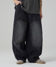 워시드 와이드 벌룬 스트링 데님팬츠 흑청