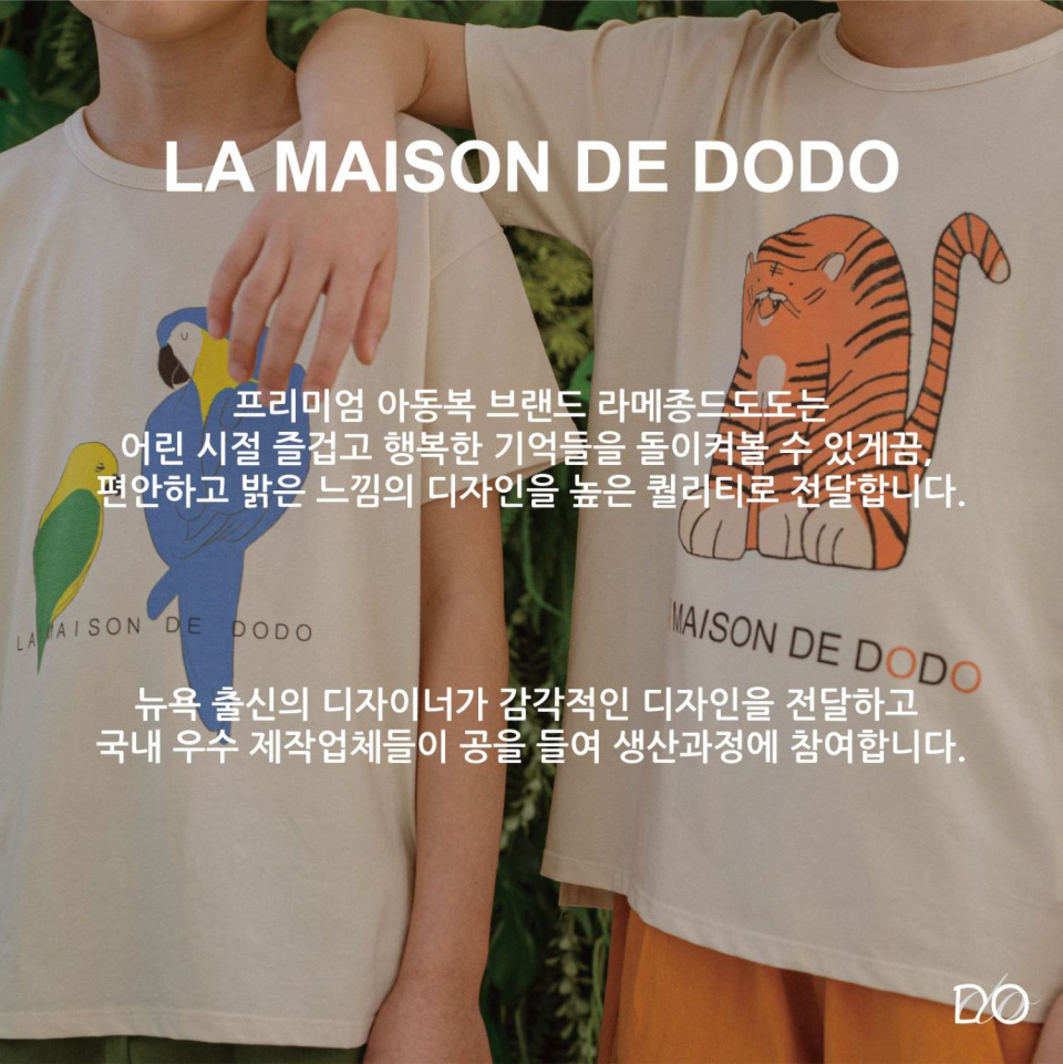 라메종드도도(LA MAISON DE DODO)는 어린 시절 즐겁고 행복한 기억을 돌이켜볼 수 있게끔 편안하고 밝은 느낌의 디자인을 높은 퀄리티로 전달하는 프리미엄 아동복 브랜드입니다. 뉴욕 출신 디자이너의 감각적인 디자인과 국내 우수 제작 업체의 뛰어나고 꼼꼼한 퀄리티를 기반으로 합니다.