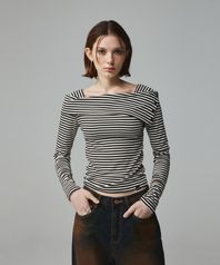 스트라이프 오프숄더 롱슬리브 티셔츠 아이보리