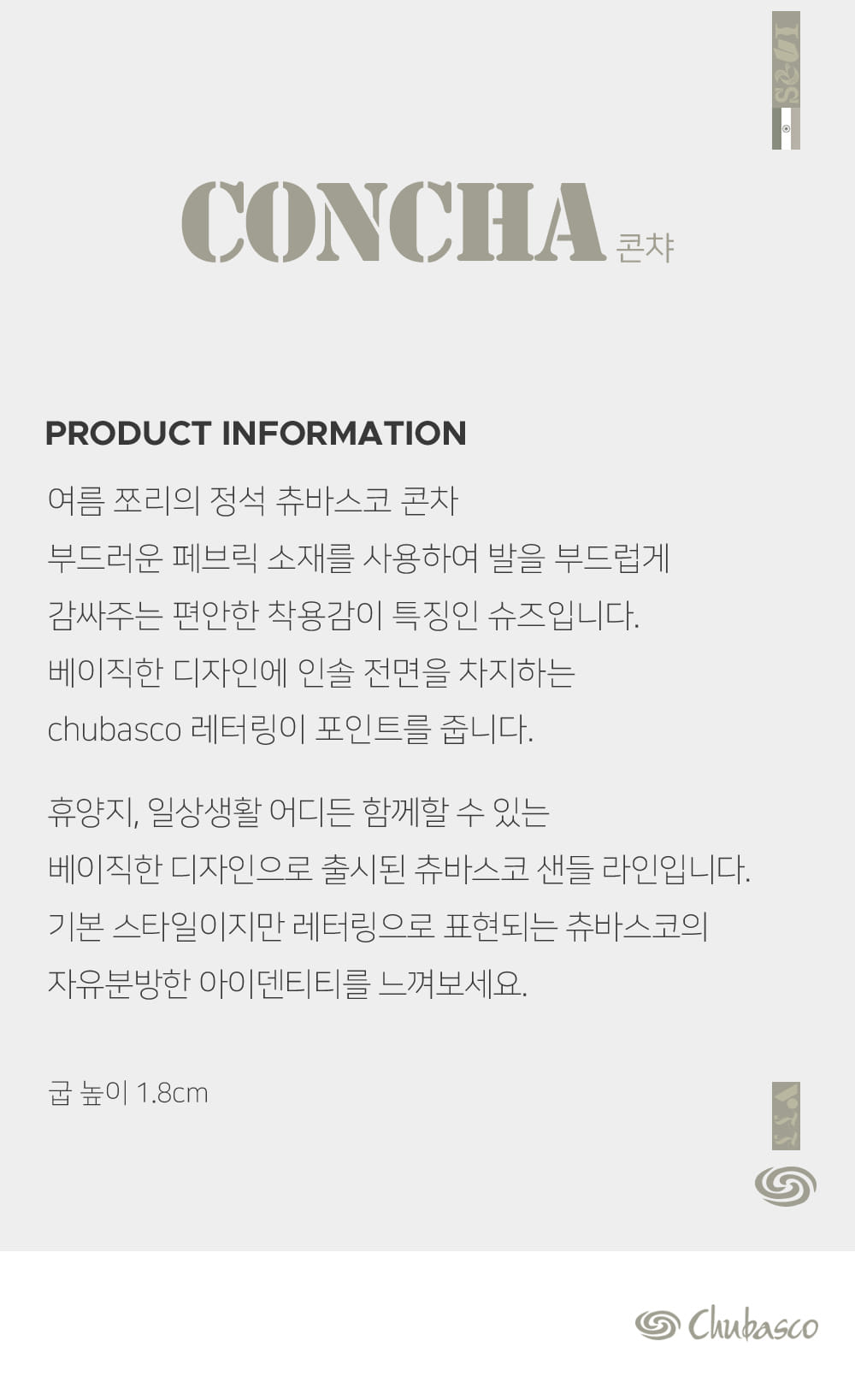 CHUBASCO(츄바스코)는 미국 샌디에이고에 본사를 둔 아웃 오더 슈즈 메이커입니다. 해안가 도시에서 캠핑과 서핑 등의 스포츠를 즐기며 자란 디자이너들에 의해 디자인되었습니다. 멕시코 전통신발인, 가죽을 땋아 만든 'Huarache'에서 영감을 얻어 나일론, 레더 위브, 소가죽 등의 현대 소재와 기술을 응용하여 편안함과 쾌적함을 제공합니다.