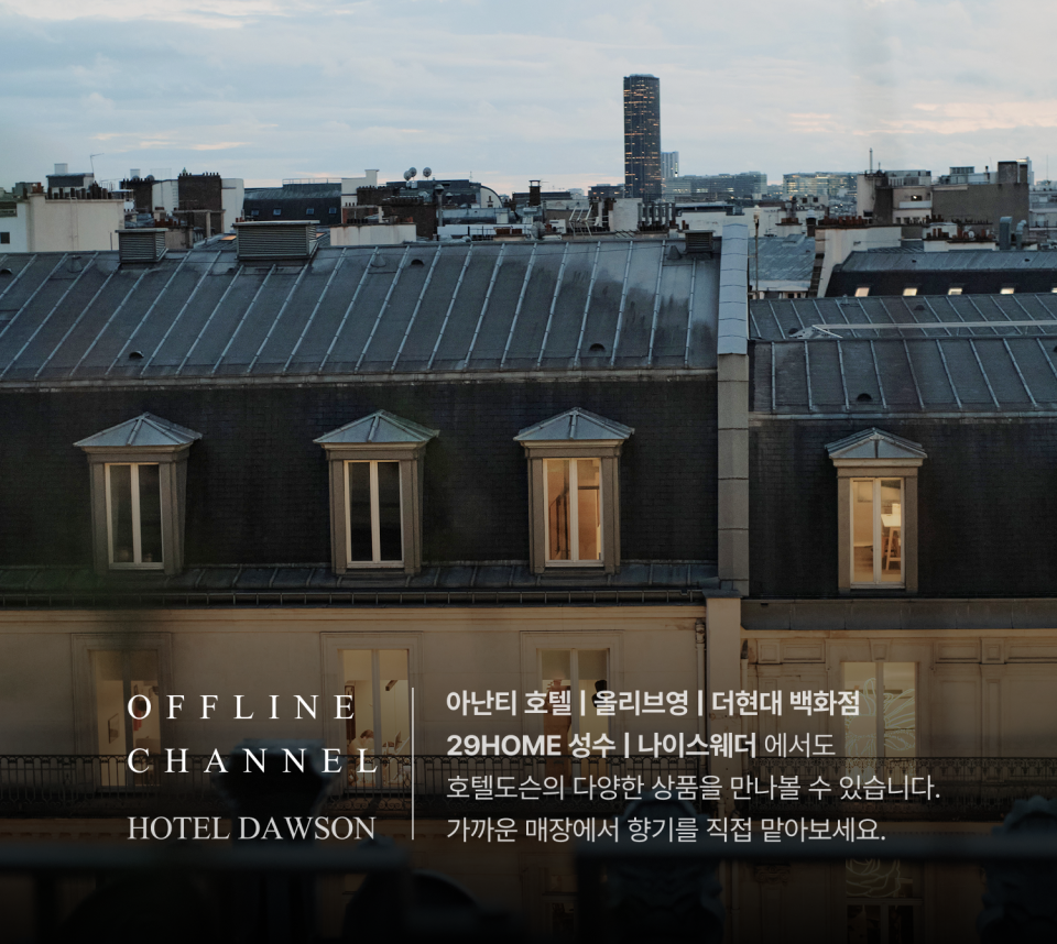 호텔도슨(HOTEL DAWSON)은 유럽의 어느 도시, 고풍스럽고 유서 깊은 호텔의 감성을 모티브로 개인의 취향을 고려한 깊이 있는 향을 디자인하는 프래그런스 브랜드입니다.