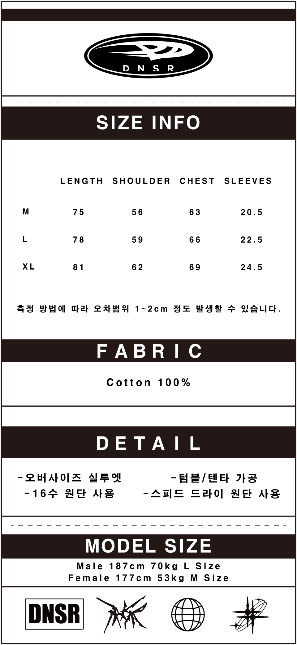 디앤에스알(DNSR)는 'Do New things, Something to realize'라는 슬로건을 바탕으로, 동시대에 흐름에 발 맞춰 항상 독창적이고 새로운 시도를 하고 있습니다. 디앤에스알의 DNA는 현대 복식을 기반으로 하는 오리지널리티의 견고한 테일러링을 고수하며 시대의 흐름을 읽고 변화하는 무드와 스타일링을 제안하는 스트릿 캐주얼 웨어입니다.
