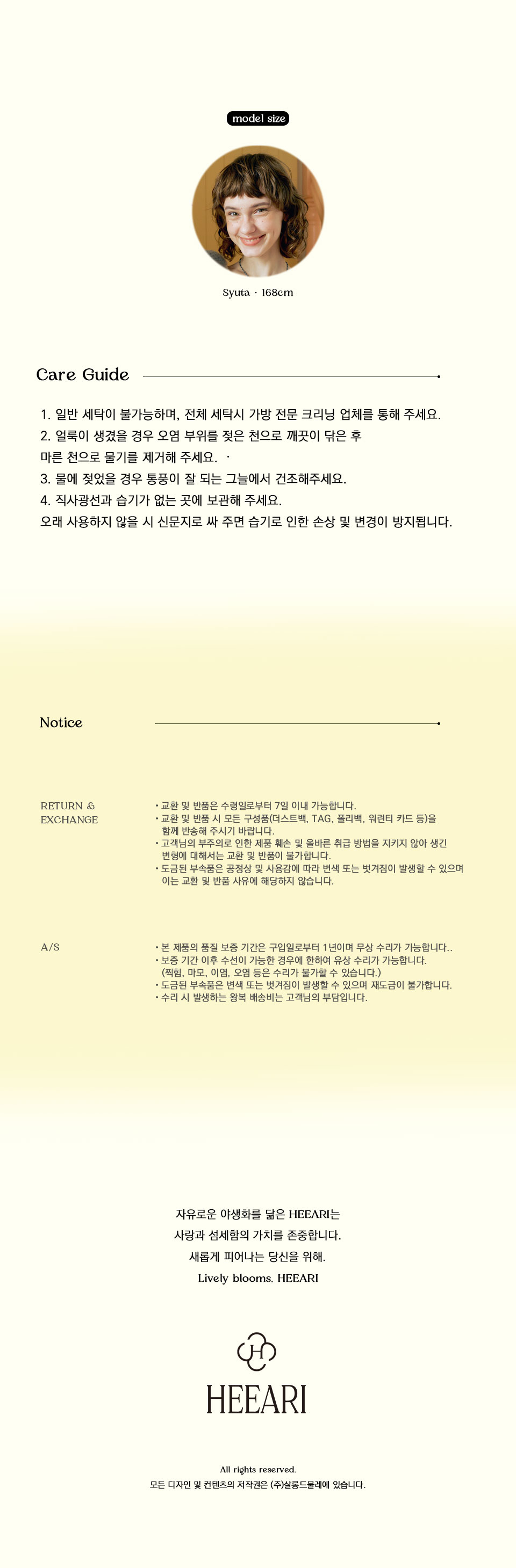 히어리(HEEARI)는 자유로운 야생화를 닮았으며, 새롭게 피어나는 당신을 위해 사랑과 섬세함의 가치를 존중합니다.