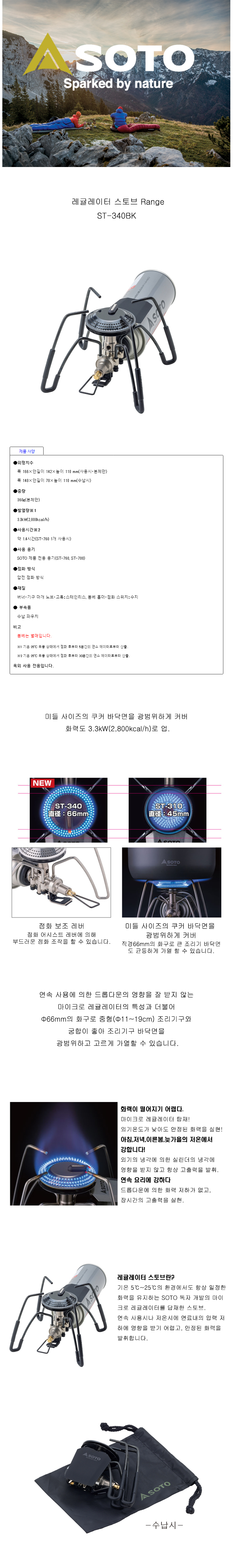 소토(SOTO)는 일본어로 아웃도어를 의미합니다. 소토의 버너와 토치 등 캠핑용품은 극한의 기후 조건에서도 뛰어난 성능을 자랑하여 많은 캠퍼에게 사랑받고 있습니다.