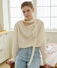 Draped Neck Tie Blouse - Cream Yellow
