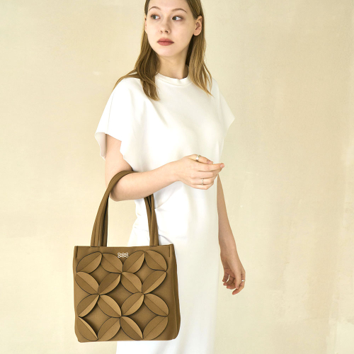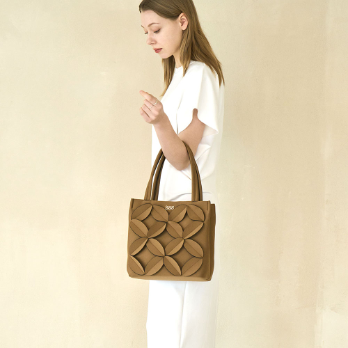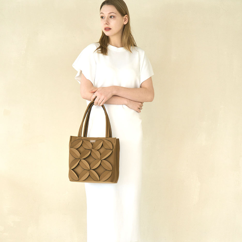 사각 형태의 토트백으로 독특한 쉐잎이 돋보이며, 네오프렌 소재에 심지를 추가하여 세울 수 있도록 보강하였습니다.