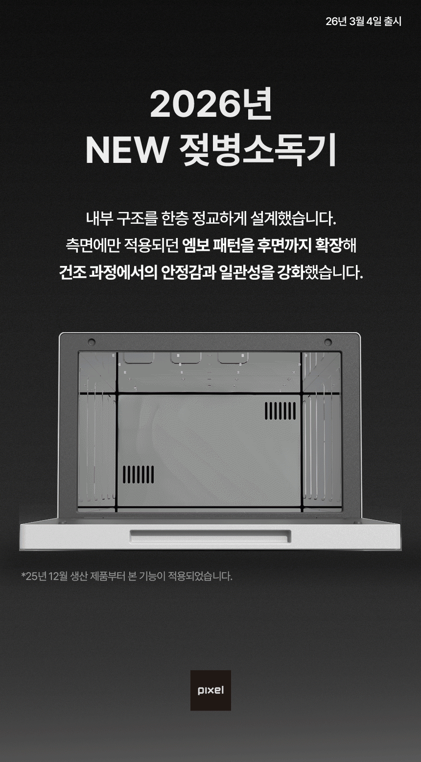 픽셀(PIXEL)은 폴레드 내 유아전자기기 헬스케어 브랜드입니다. 메인 제품인 젖병 소독기는 넓은 내부 용량과 비스포크 디자인으로 공간 친화적이며, 톡톡튀는 개성을 표현할 수 있습니다.