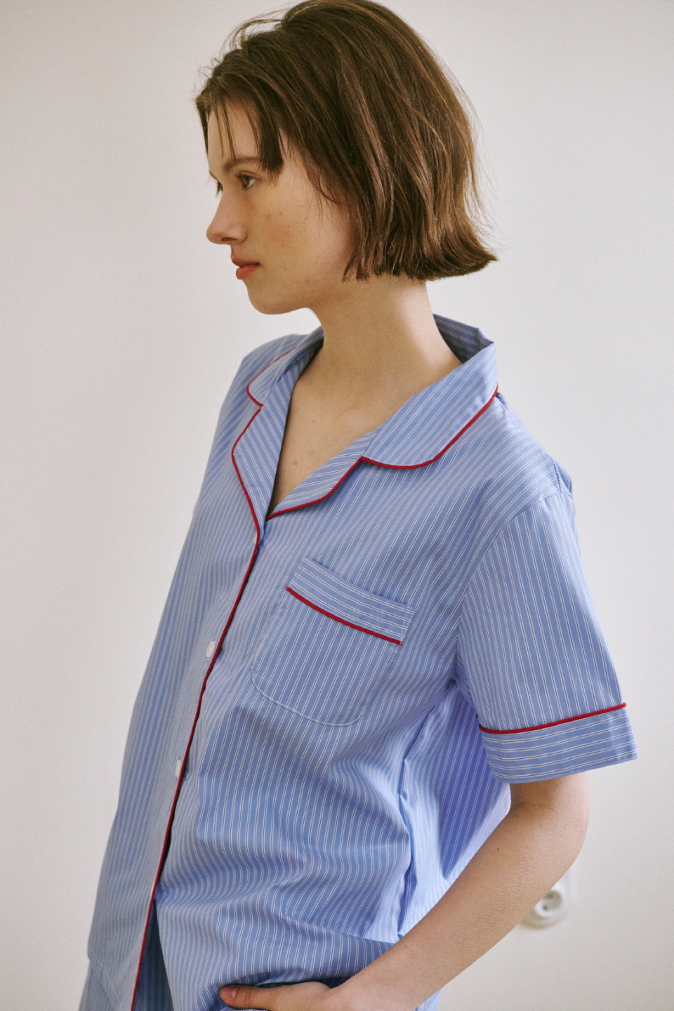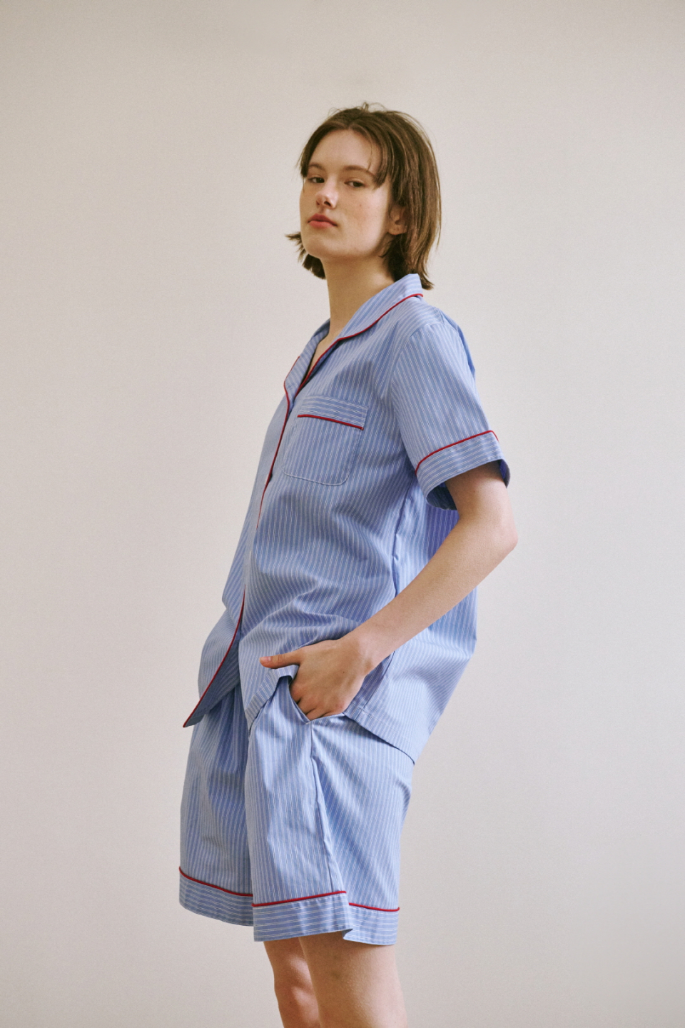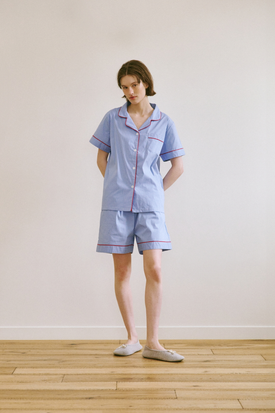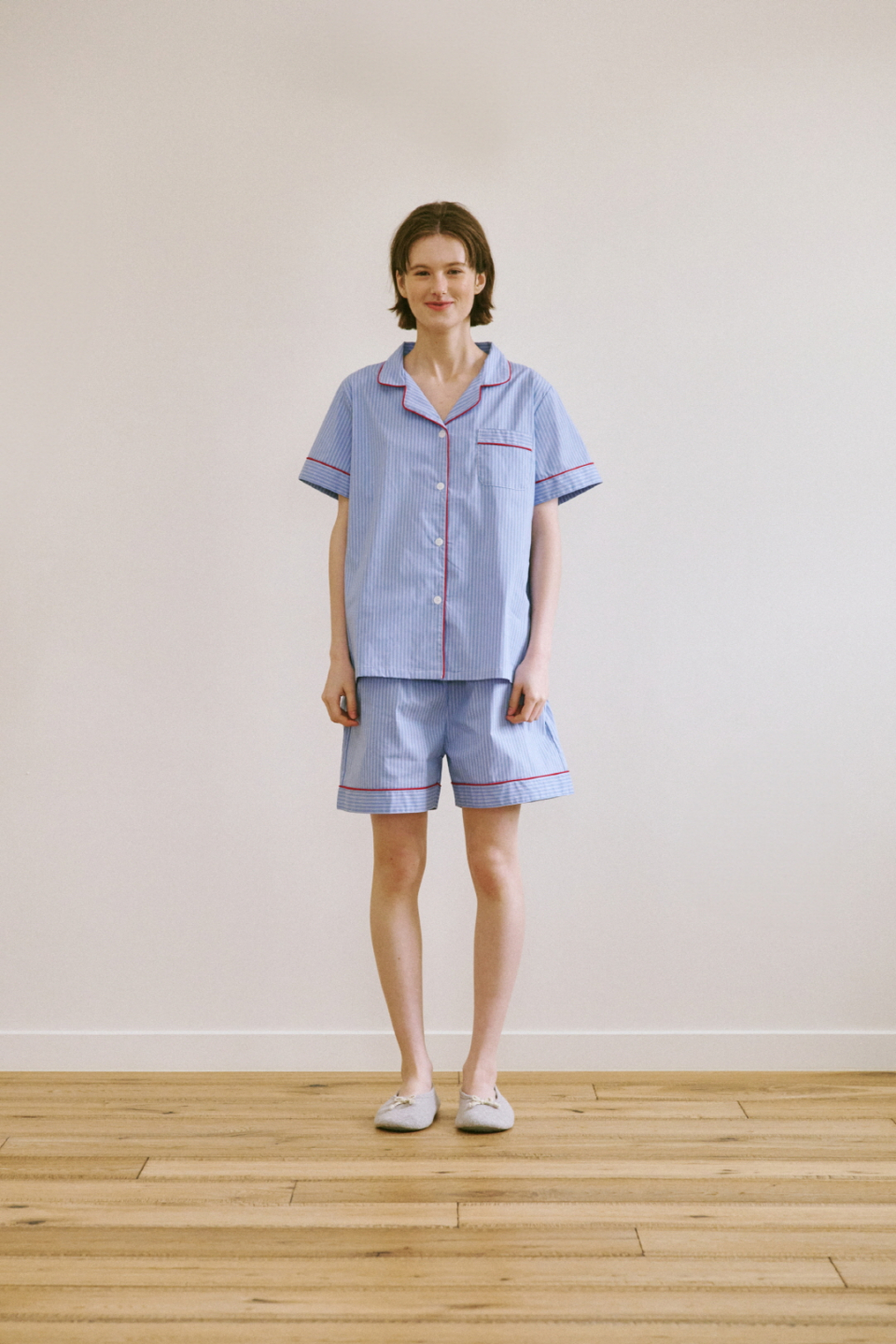 (w)스탠다드 티킹 스트라이프 파자마 반소매세트 블루