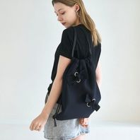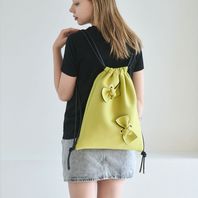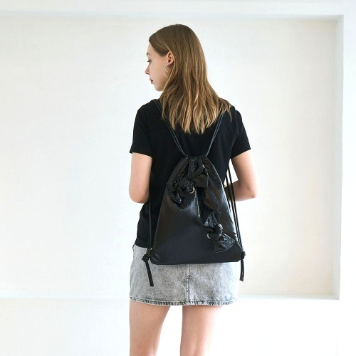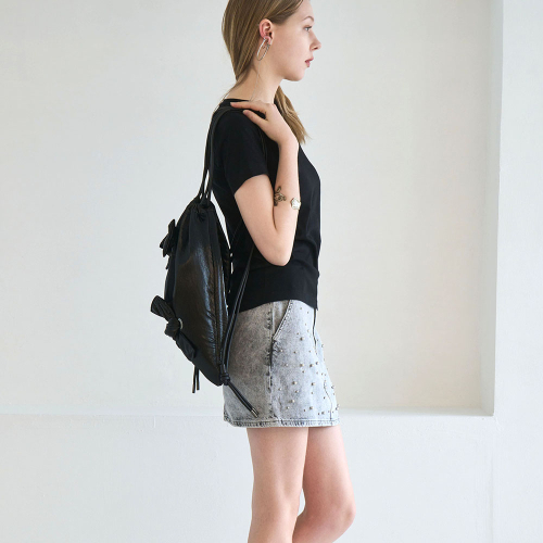 글로시한 소재에 도톰한 솜을 넣어 매듭으로 묶어 리본 포인트 준 백팩입니다.