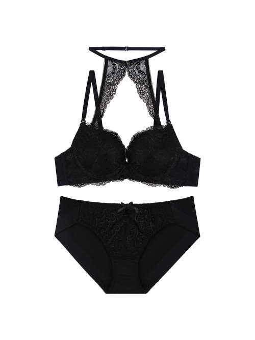 핫썸머 스트링 프론트 훅 브라 / 레이스팬티 세트_블랙