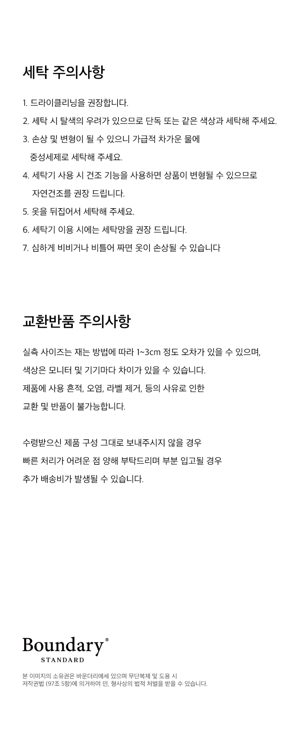 바운더리(BOUNDARY)는 현대인의 바쁜 일상 속에서도 놓칠 수 없는 깔끔한 실루엣과 색감 중심의 스타일을 추구하는 타임리스 브랜드입니다.