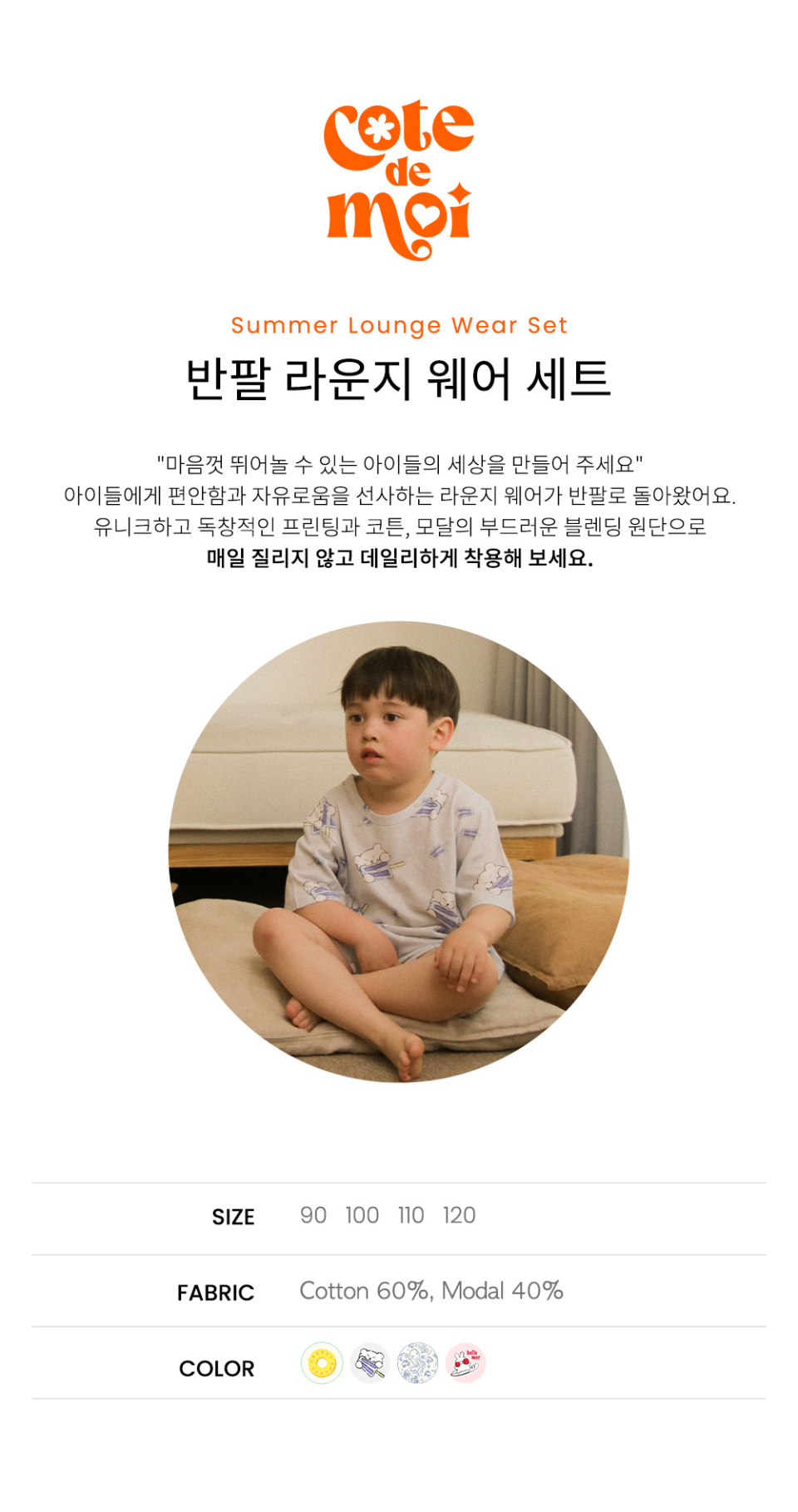 꼬떼드무어(COTE DE MOI)는 '내 옆에'라는 뜻을 담고 있습니다. 아이들과의 모든 순간을 함께하고자 하는 마음을 담아 디자인한 브랜드입니다.