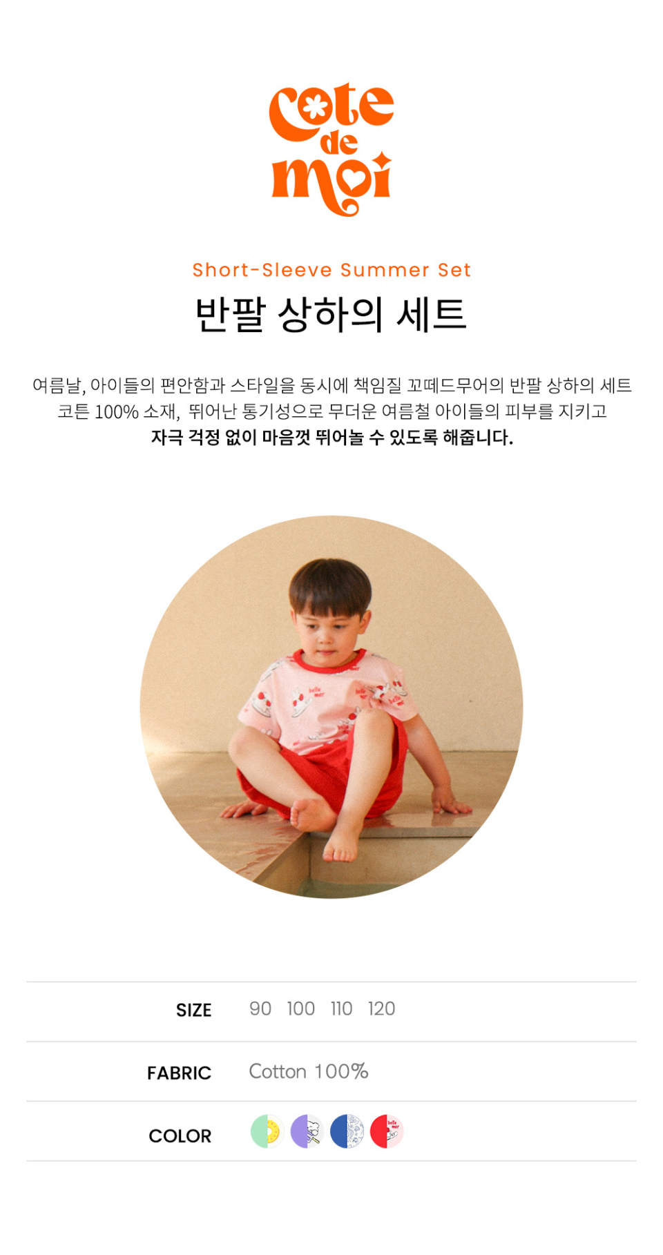 꼬떼드무어(COTE DE MOI)는 '내 옆에'라는 뜻을 담고 있습니다. 아이들과의 모든 순간을 함께하고자 하는 마음을 담아 디자인한 브랜드입니다.