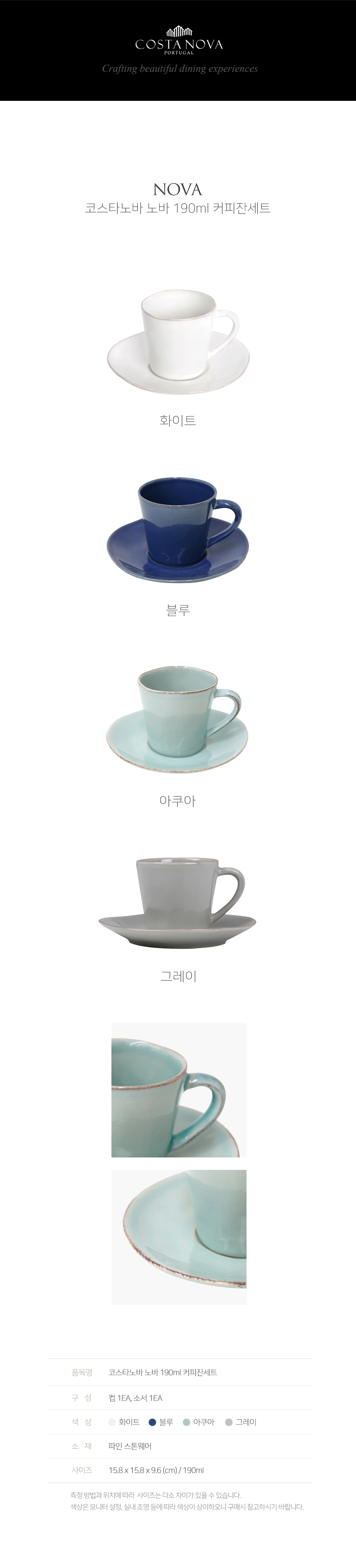 코스타노바(COSTA NOVA)는 세계적인 도자기 전문 기업 '그레스텔'이 1998년에 만든 포르투갈의 대표 브랜드입니다. 포르투갈의 우수한 천연 자원과 도자기 장인들에 의해 탄생하여, 삶의 가치와 가족 또는 친구들과 함께하는 행복을 담아 제작합니다. 지중해의 풍부한 감성으로 고객의 라이프 스타일을 더욱 풍요롭게 합니다.