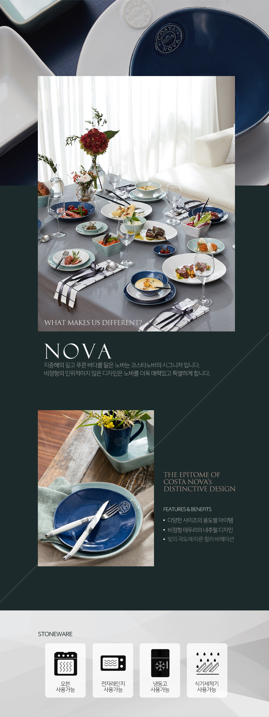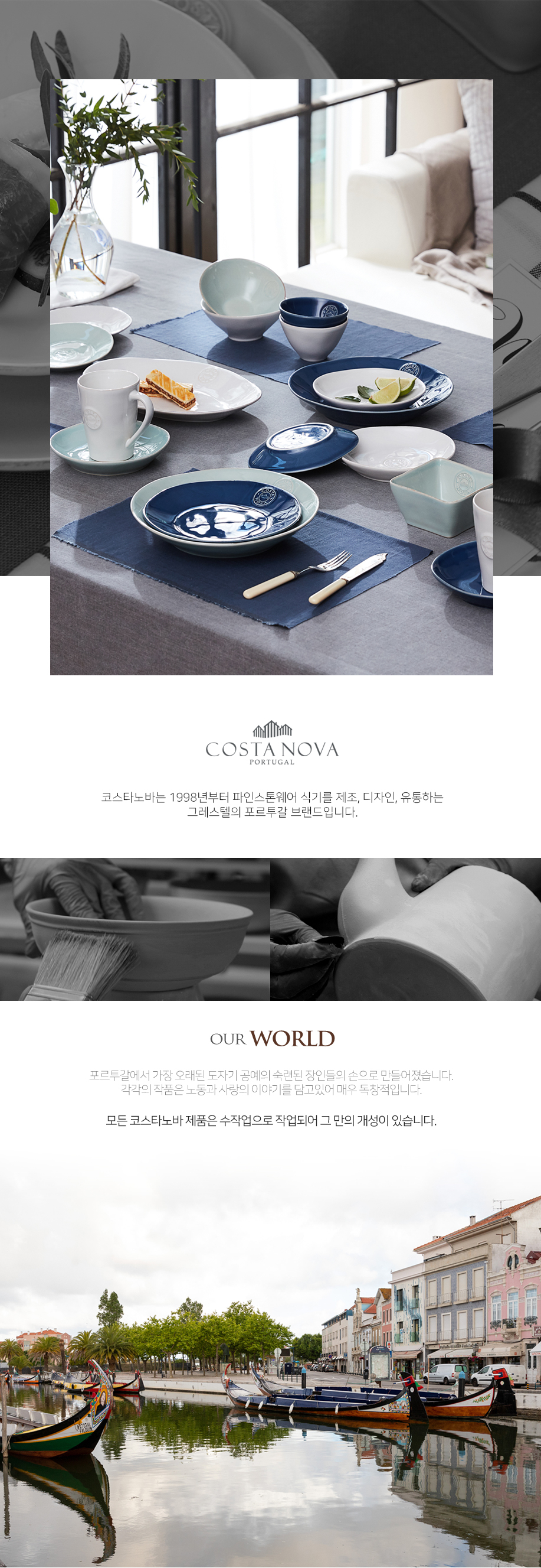 코스타노바(COSTA NOVA)는 세계적인 도자기 전문 기업 '그레스텔'이 1998년에 만든 포르투갈의 대표 브랜드입니다. 포르투갈의 우수한 천연 자원과 도자기 장인들에 의해 탄생하여, 삶의 가치와 가족 또는 친구들과 함께하는 행복을 담아 제작합니다. 지중해의 풍부한 감성으로 고객의 라이프 스타일을 더욱 풍요롭게 합니다.