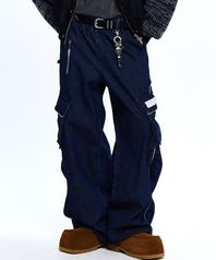 WRINKLE MIXED STRIPE CARPENTER DENIM PANTS - DENIM