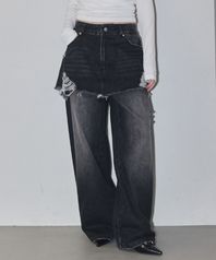 Layered Skirt Denim Pants Black