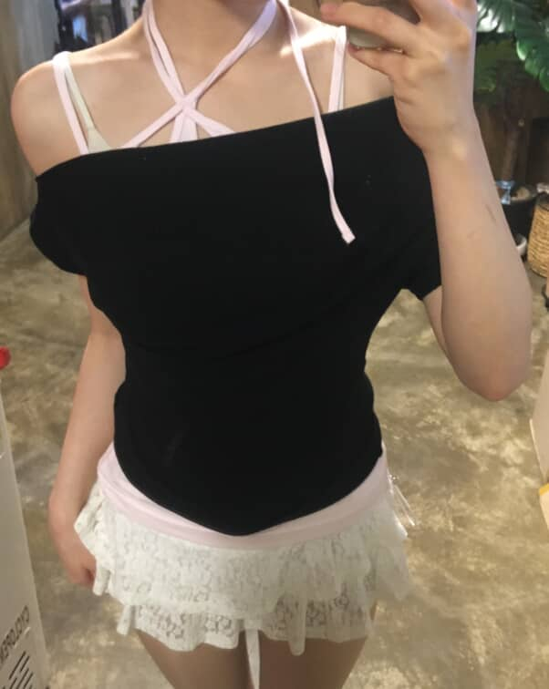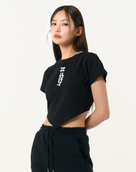 우먼스 스카프 포인트 크롭 반팔 티셔츠 블랙