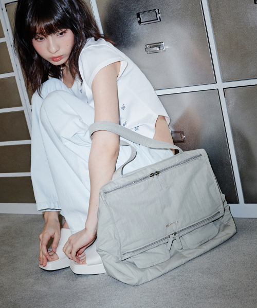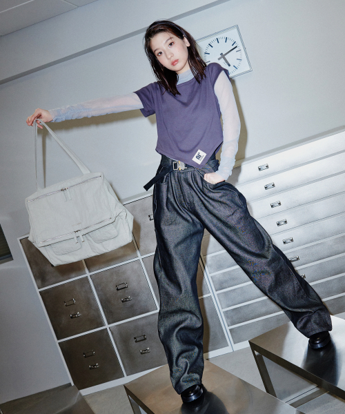 하나의 숄더끈으로 착용시 자연스럽게 늘어지는 핏감이 멋스러운 스타일입니다.