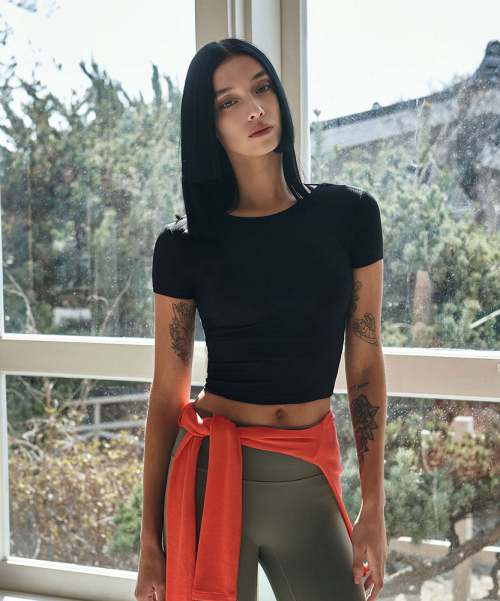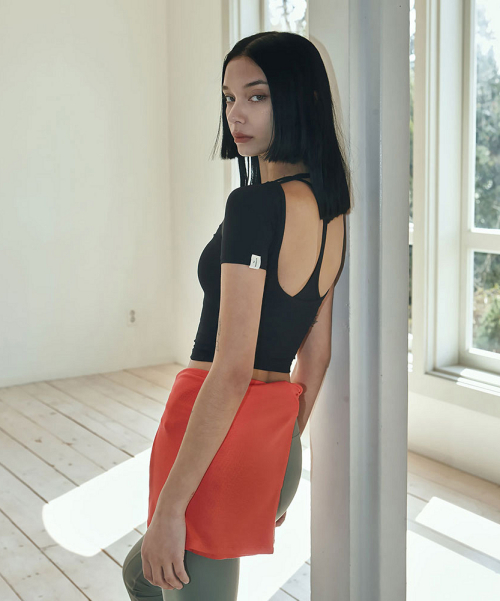 여성 요가복 DEVI-T0107-블랙 필라테스 오픈백 스트랩 숏슬리브
