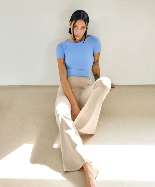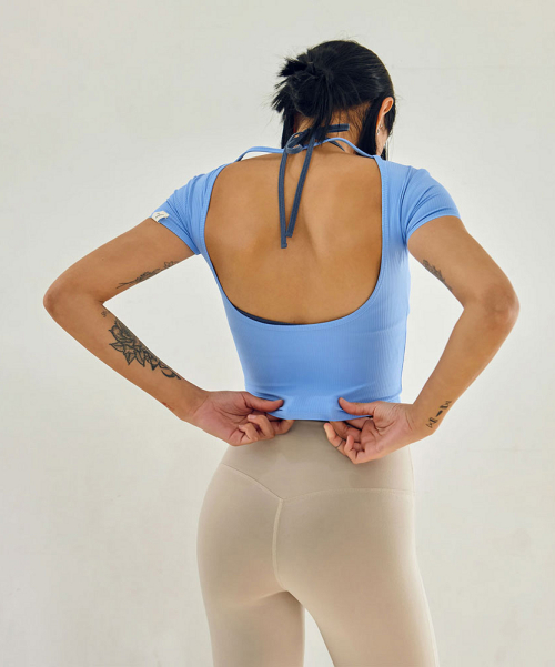 여성 요가복 DEVI-T0107-애저블루 필라테스 오픈백 스트랩 숏슬리브