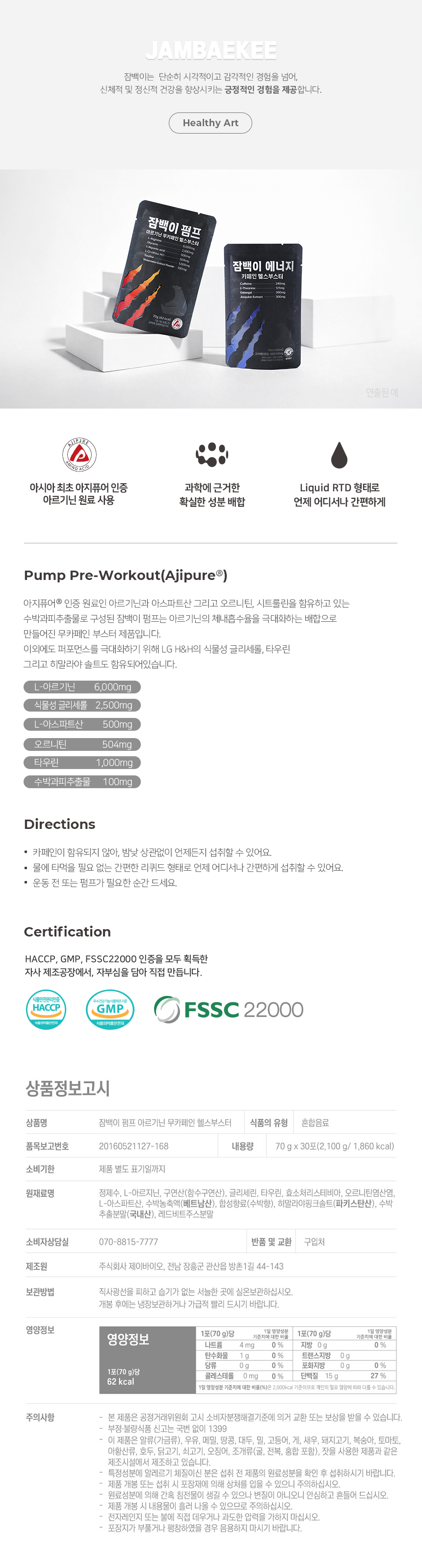 잠백이(JAMBAEKEE)는 국내 최대 헬스 커뮤니티를 기반으로 건강즙, 건강기능식품, 식품, 헬스보충제 등 다양한 제품을 제조 및 판매하는 브랜드입니다. 대한민국 국민들이 건강한 삶을 보내실 수 있도록 사명을 가지고 있습니다.