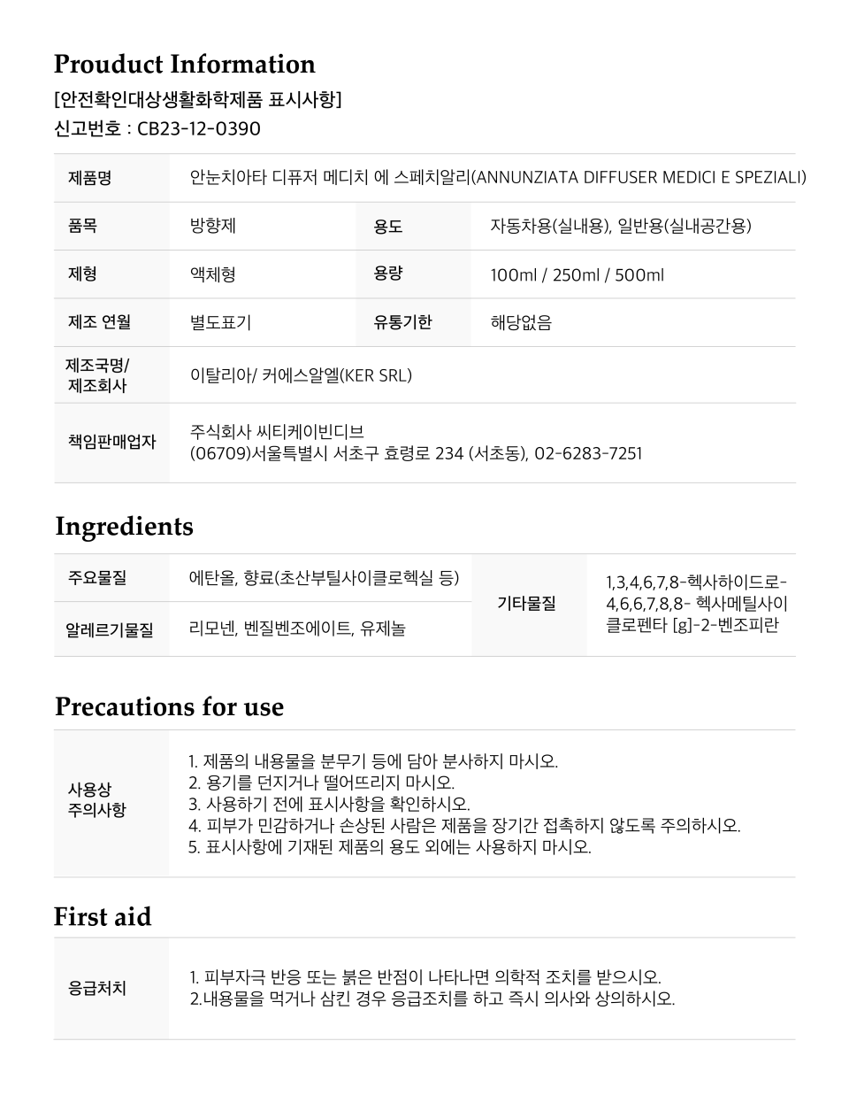 칼촐라이 디퓨져 100ml/250ml