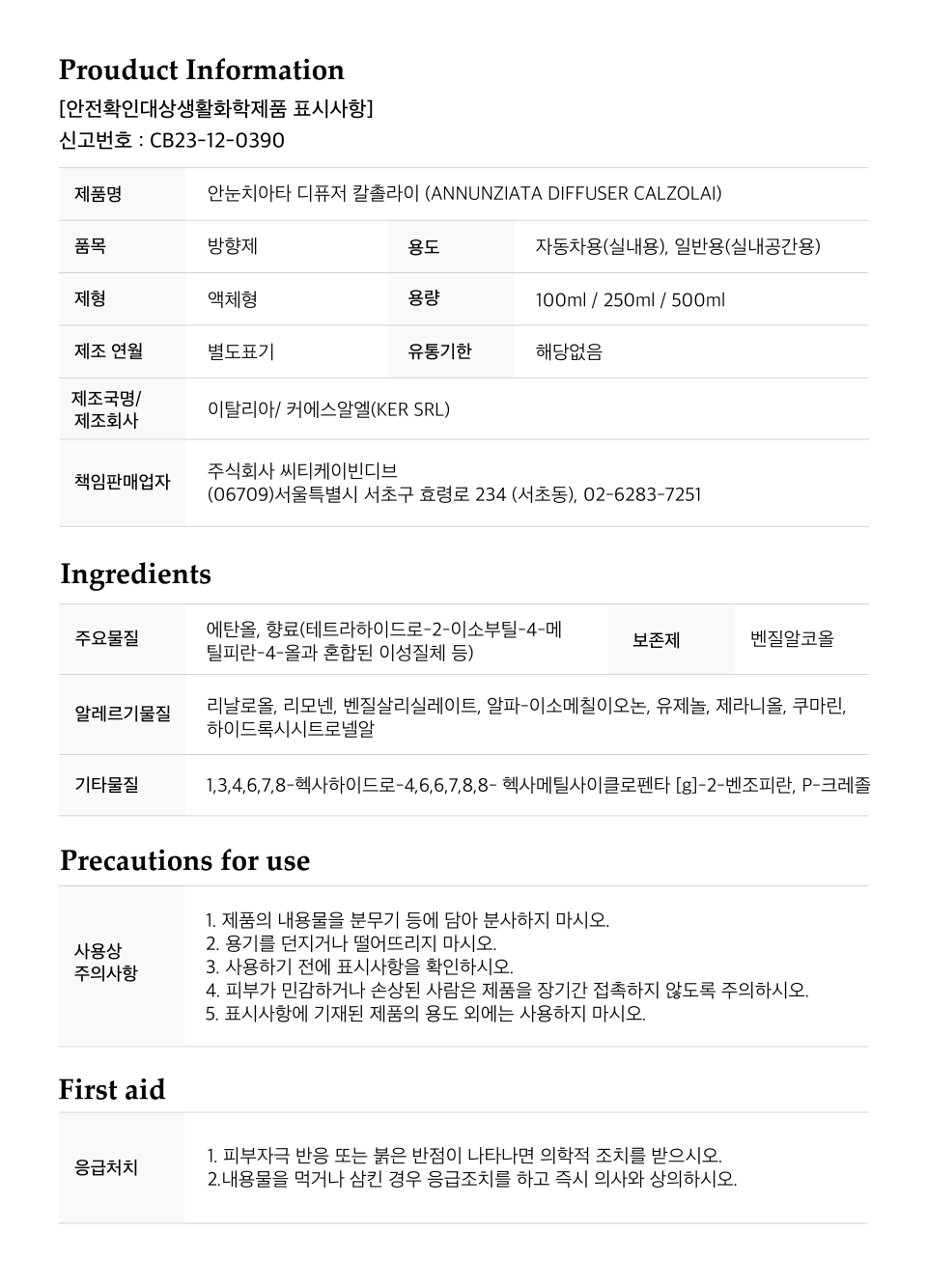 칼촐라이 디퓨져 100ml/250ml