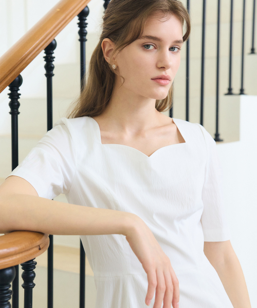 목선과 쇄골라인을 예쁘게 보여주는 하트넥의 미디 드레스입니다.