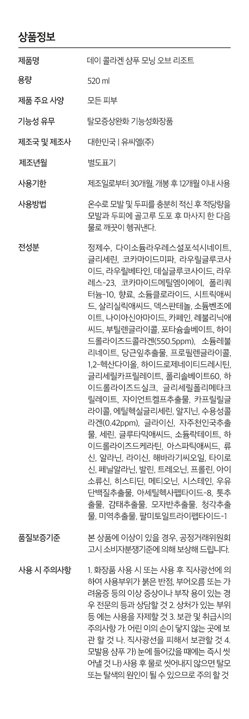 [건성볼륨/탈모기능성] 데이 콜라겐 샴푸 520ml (+샴푸 3종 8ml)