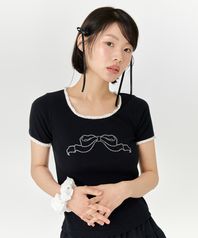 리본 큐빅 티셔츠 - 블랙