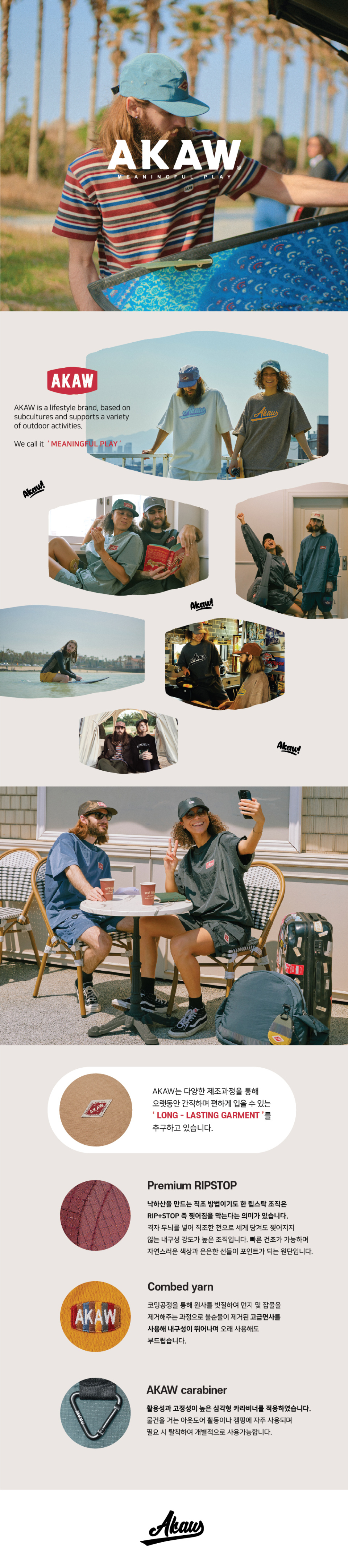 아카우(AKAW)는 자연에서 이루어지는 서브컬처에 초점을 맞춘 아웃도어 브랜드입니다. 서핑이나 캠핑, 러닝, 스키, 클라이밍 등 자연과 함께 할 수 있는 다양한 활동을 추구합니다. 시즌별로 다양한 액티비티를 다룰 예정이며, 'MEANINGFUL PLAY'라는 슬로건 아래 자연과 함께 하는 의미 있는 취미를 지향합니다.