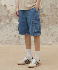 버뮤다 와이드 원턱 카고 데님 쇼츠 [미디엄블루]