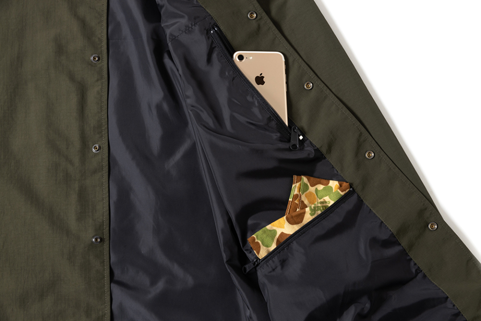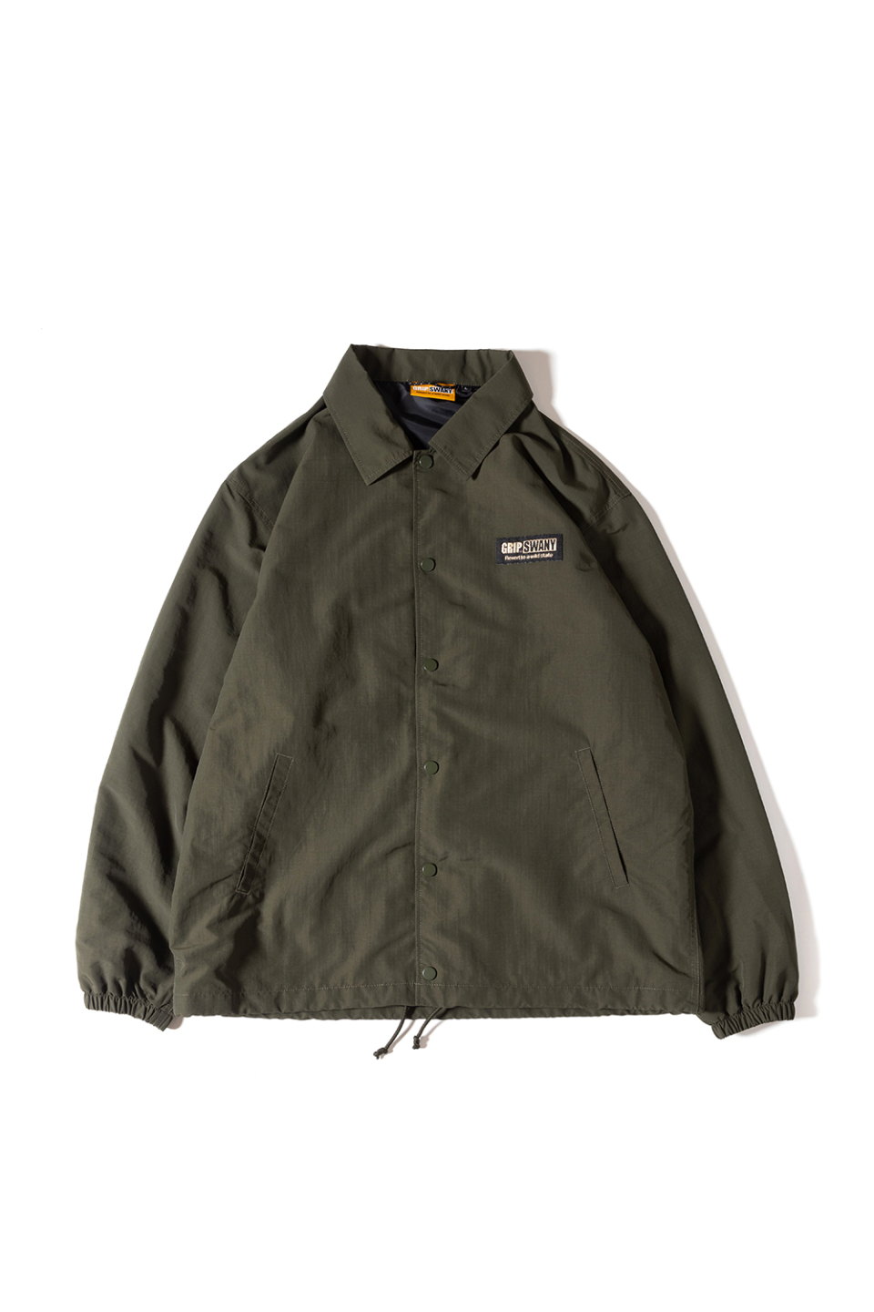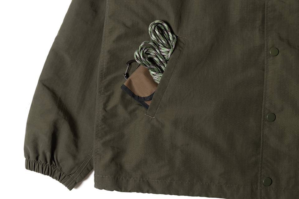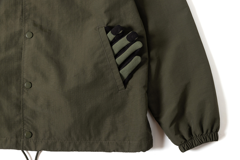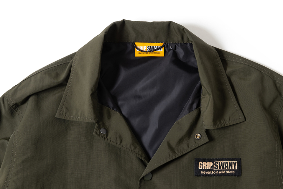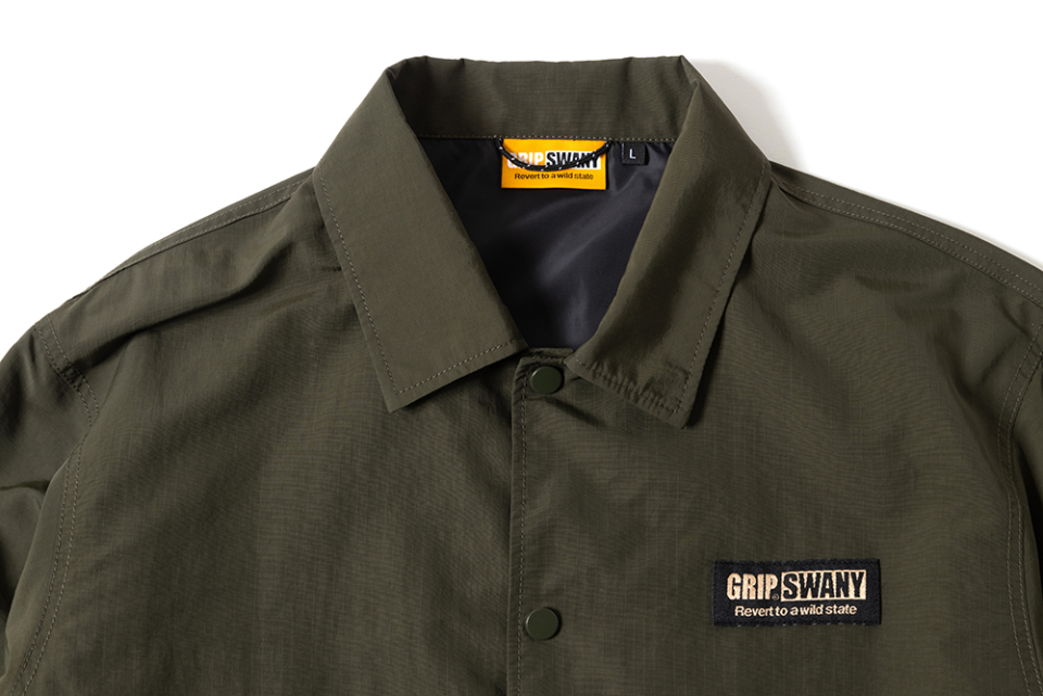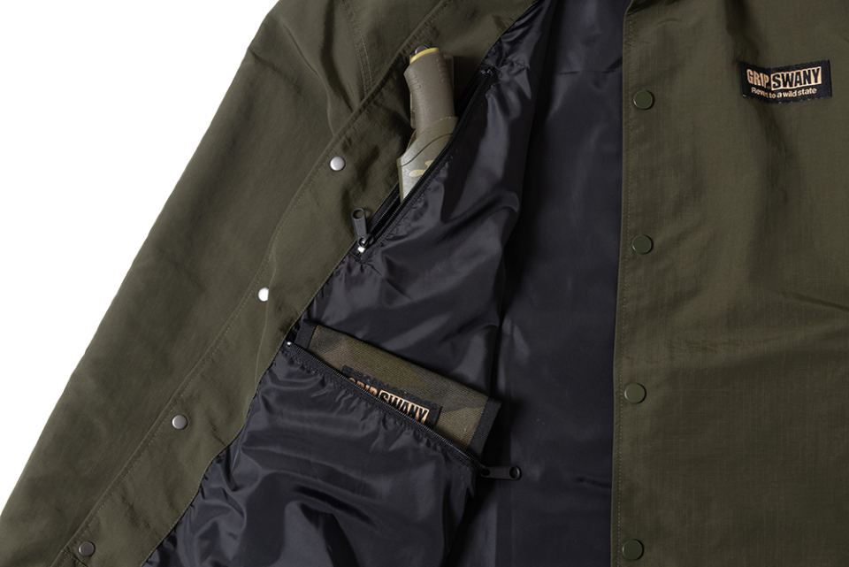 헤비 웨이트, 립스탑 나일론 소재로 제작된 방수성 코치 자켓. GRIP SWANY답게 자켓 곳곳에 포켓이 탑재되어 있어, 외형적으로는 심플한 디자인이지만 가방을 들고 다닐 필요가 없도록 제작 되었습니다. 등에는 GRIP SWANY GLOVE 로고가 프린트되어 있습니다.